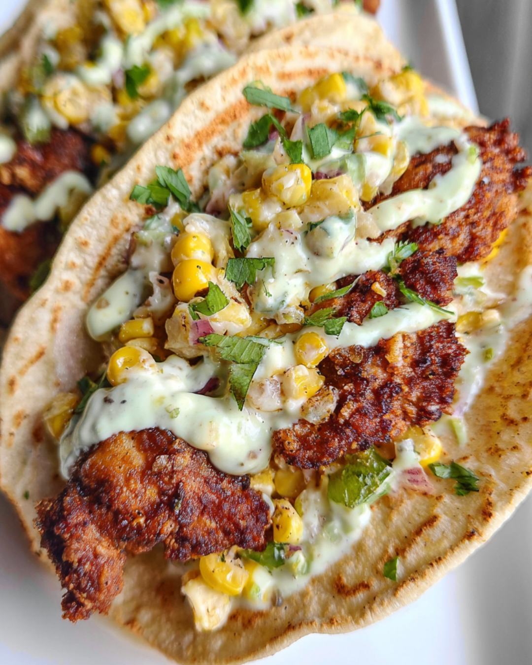 The crispy chicken, sweet corn, and zesty dressing come together in perfect harmony, making every taco a delight.