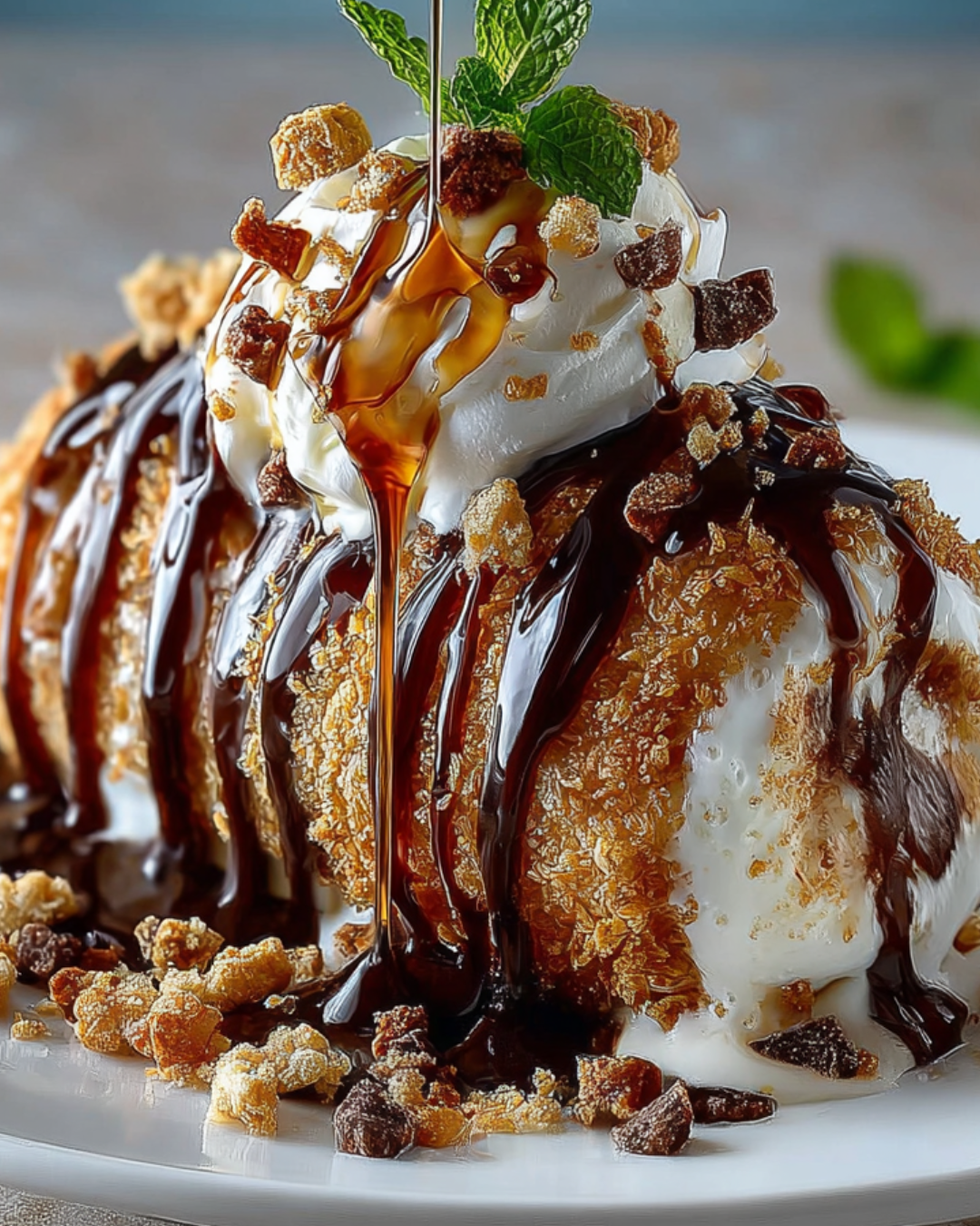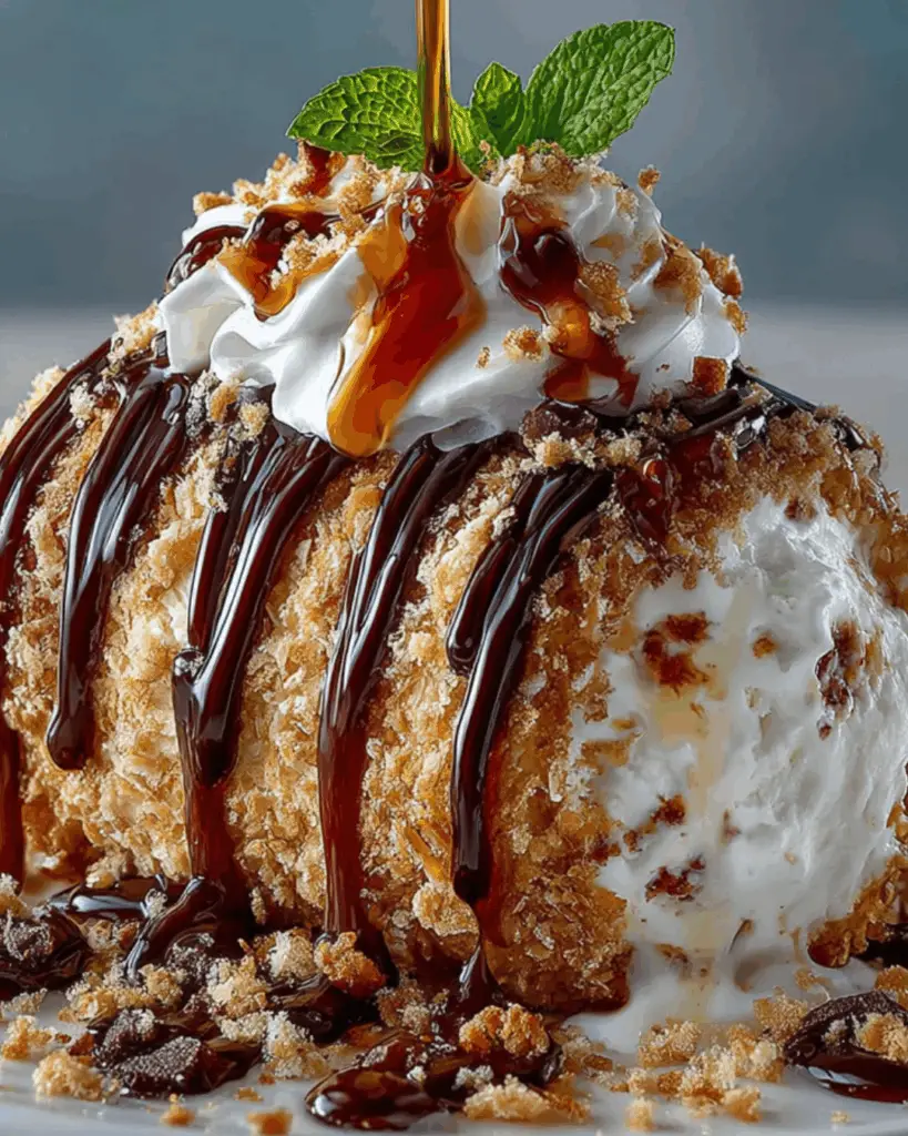 Finally, it’s time to serve your Fried Ice Cream! Drizzle with chocolate syrup, add a dollop of whipped cream, and top with a cherry for that classic touch. Enjoy this crispy, creamy treat immediately for the best experience. Your taste buds will thank you!