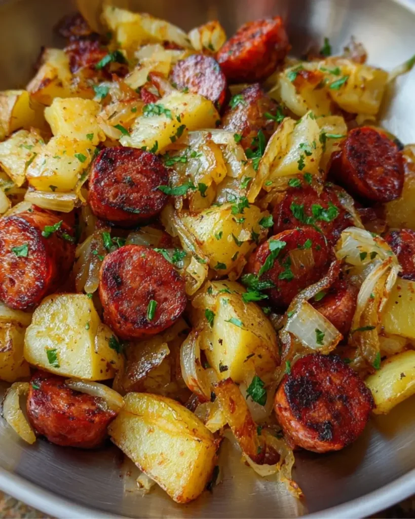 The combination of crispy potatoes, sweet onions, and smoky sausage creates a flavor explosion that’s hard to resist.