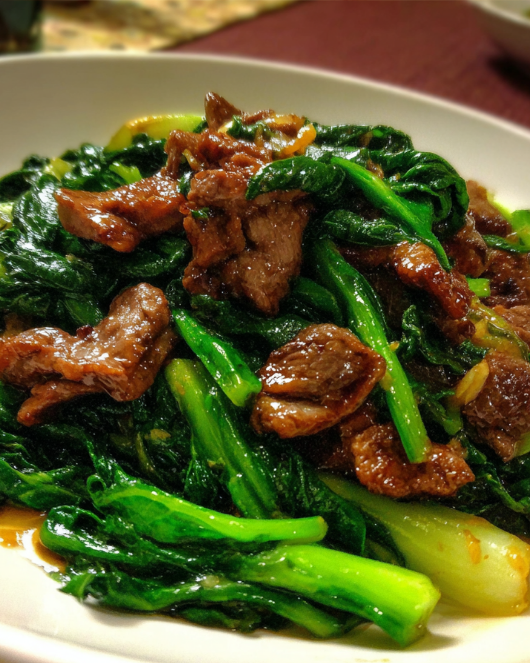 Leftovers can be stored in an airtight container in the fridge for up to three days. Reheat gently in a skillet to maintain the texture of the choy sum and beef.