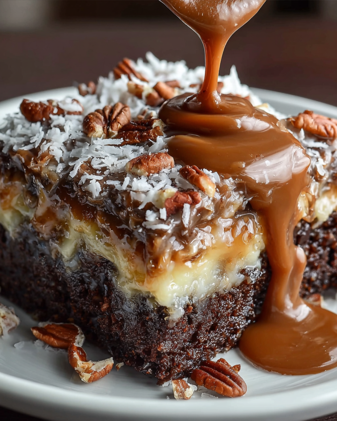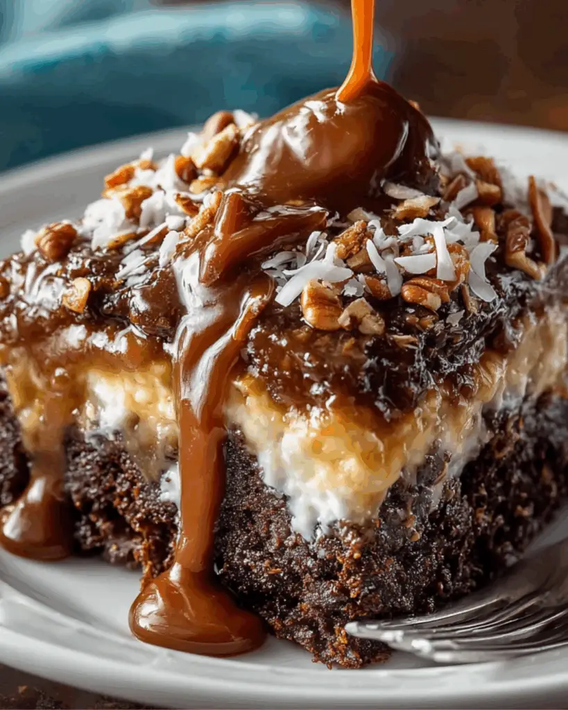 A deliciously unique German Chocolate Poke Cake that combines rich chocolate flavor with a creamy coconut and pecan topping.