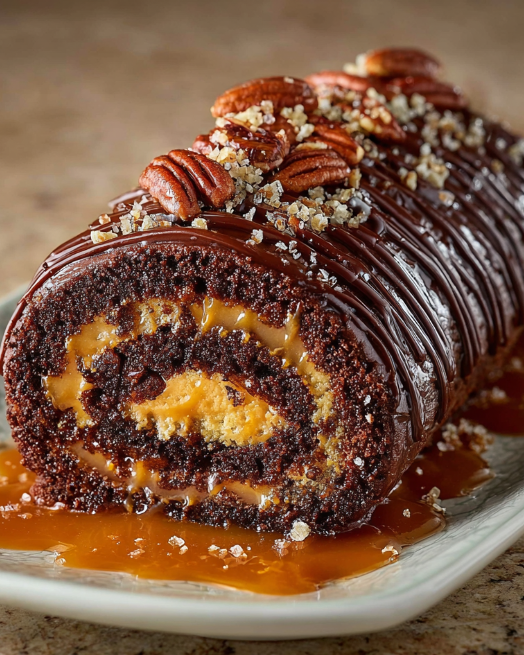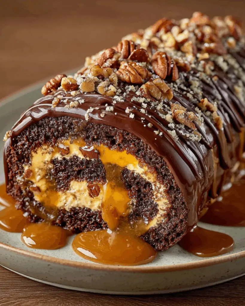 A delicious and indulgent dessert featuring a chocolate cake roll filled with creamy caramel and pecans, topped with chocolate and caramel sauce.