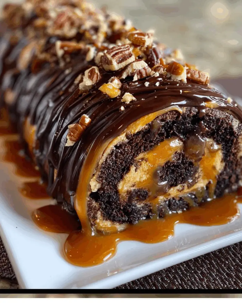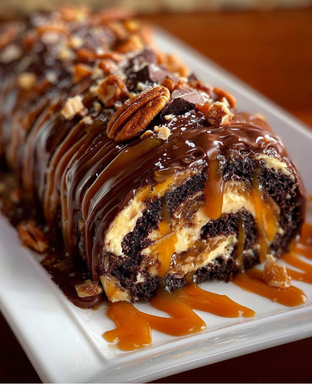 A delicious and indulgent dessert featuring a chocolate cake roll filled with cream cheese and caramel, topped with chocolate and pecans.