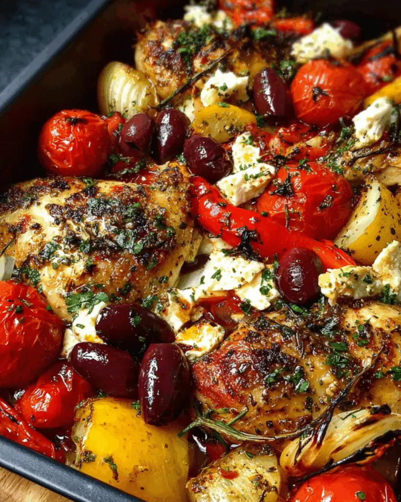 A flavorful one-pan dish featuring marinated chicken thighs, roasted vegetables, and crumbled feta cheese, perfect for a hearty meal.