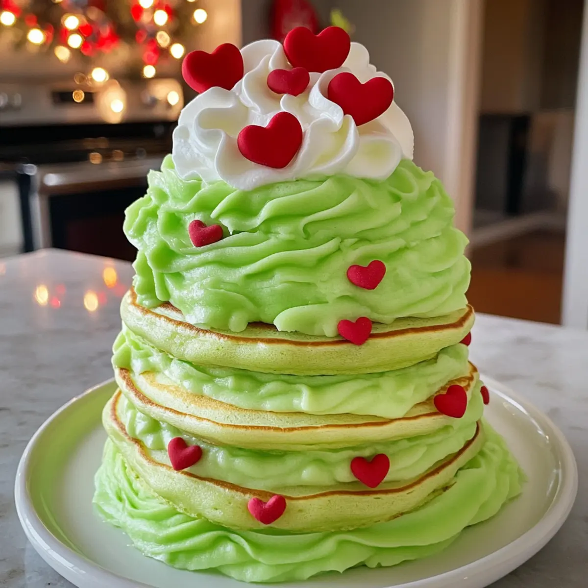 To assemble, stack your fluffy Grinch pancakes on a serving plate. Generously drizzle the cream cheese icing over the top, followed by a dollop of the green whipped cream. Finish by artfully sprinkling red candy hearts on top to add a final festive touch. Your delightful Grinch pancakes are now ready to be enjoyed as a whimsical holiday breakfast treat!