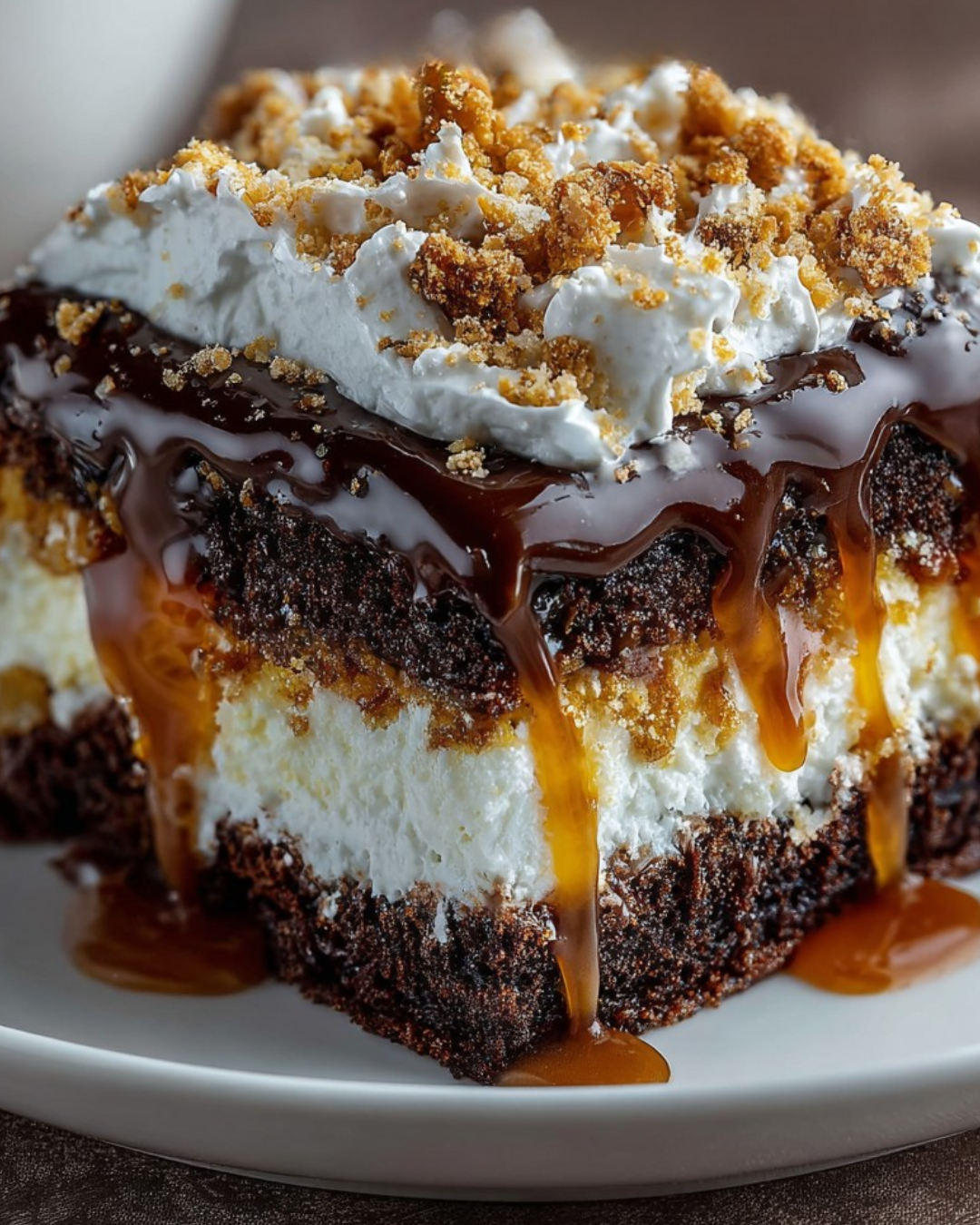 A rich and indulgent cake that combines chocolate, caramel, and whipped topping for a heavenly dessert experience.