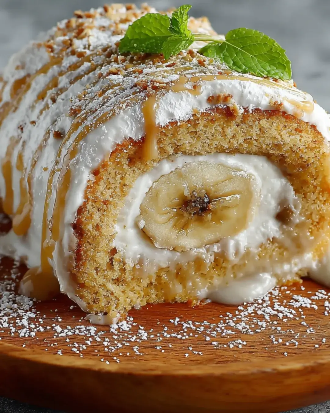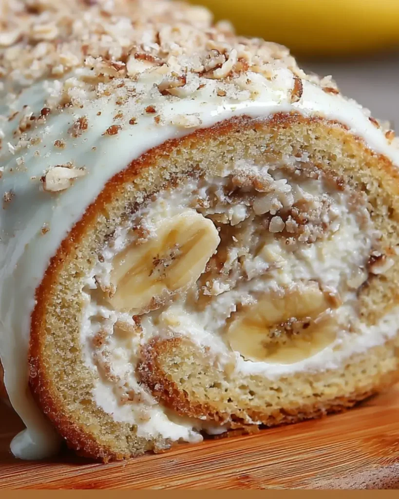 A delightful and moist banana cake roll filled with creamy cheese, perfect for dessert lovers.
