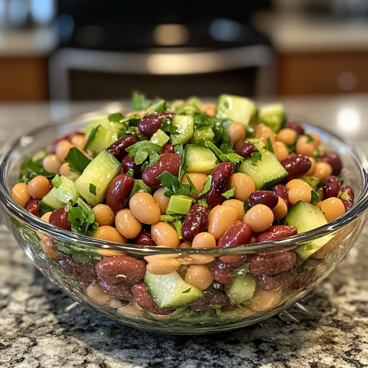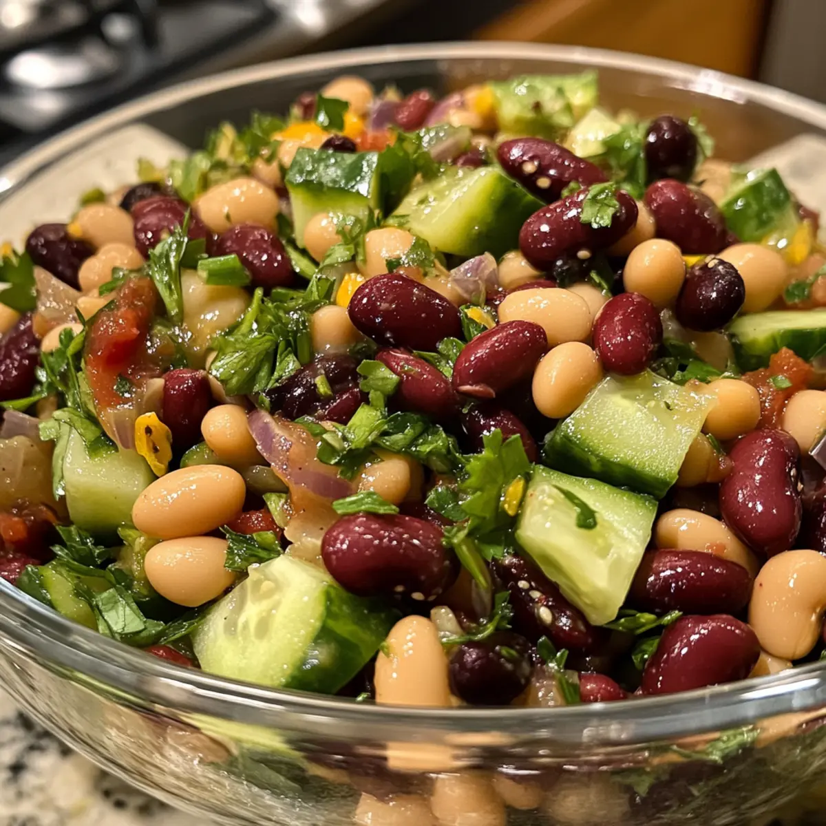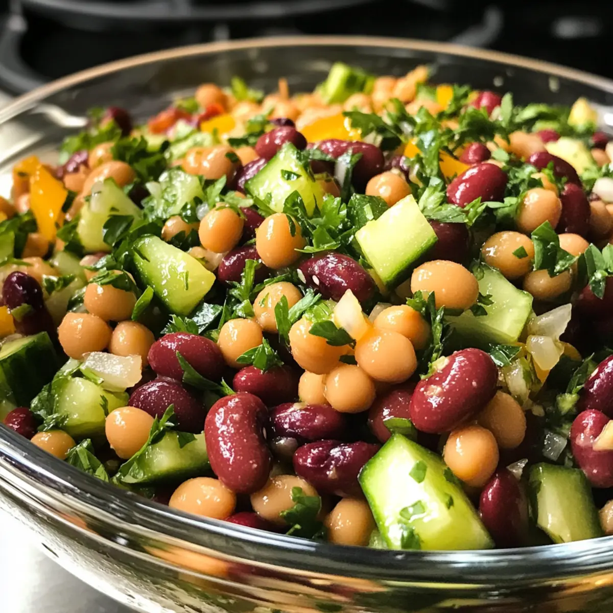 Absolutely! The main stars of the recipe are kidney beans, black beans, and garbanzo beans (chickpeas). Each type contributes protein and texture to the salad, making it hearty and nutritious. You can use canned beans for convenience, but if using dry beans, make sure to cook them before adding.