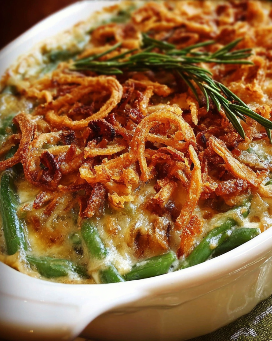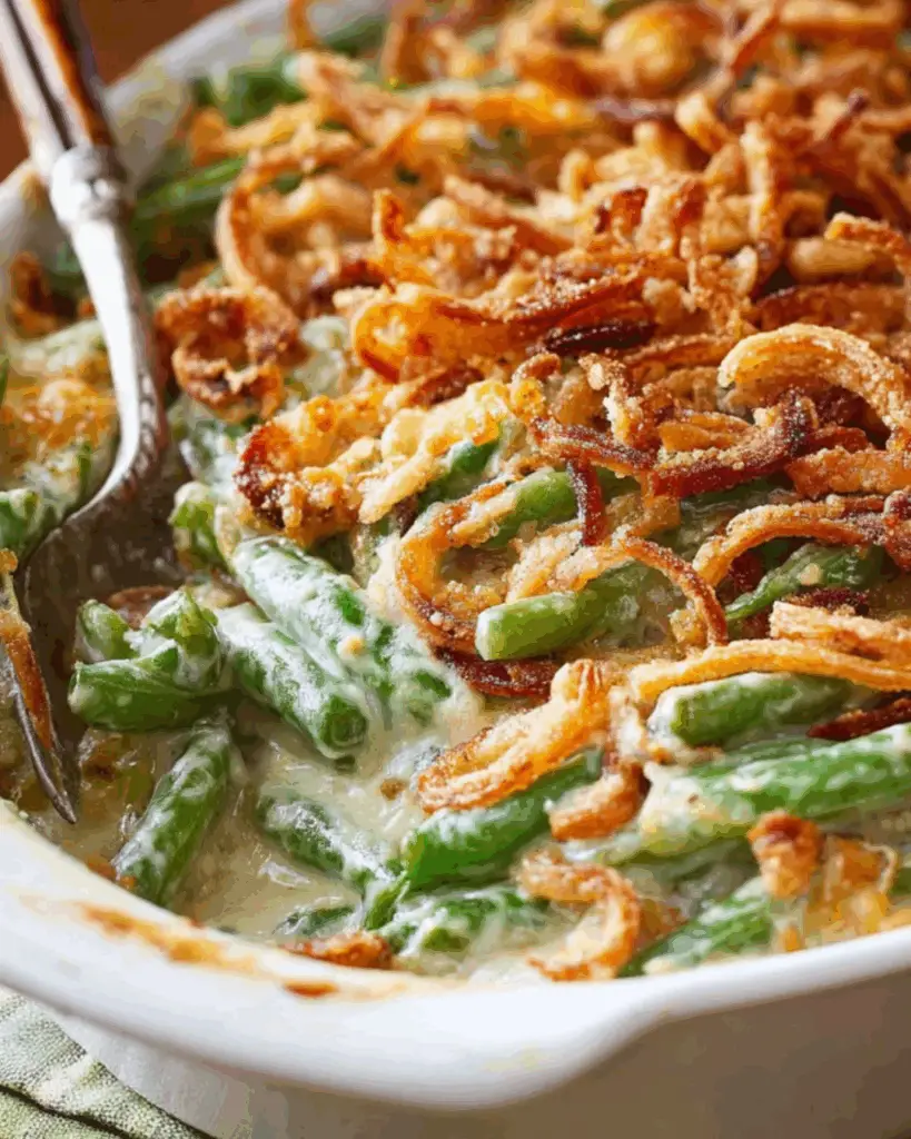A delicious and creamy green bean casserole topped with crispy French fried onions, perfect for any occasion.
