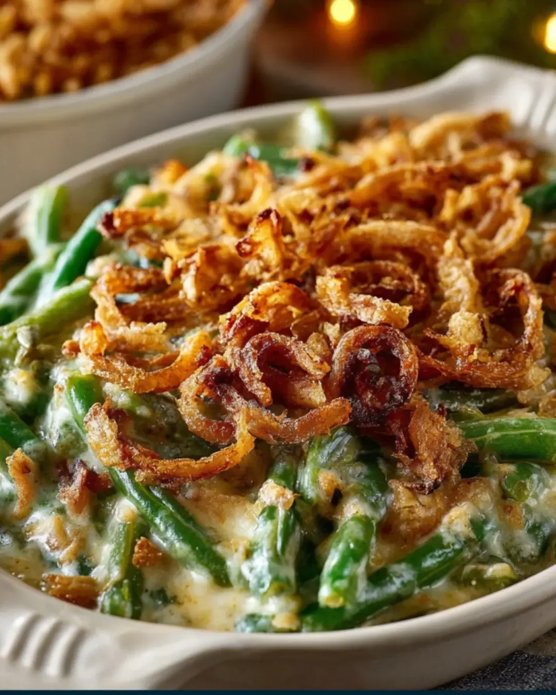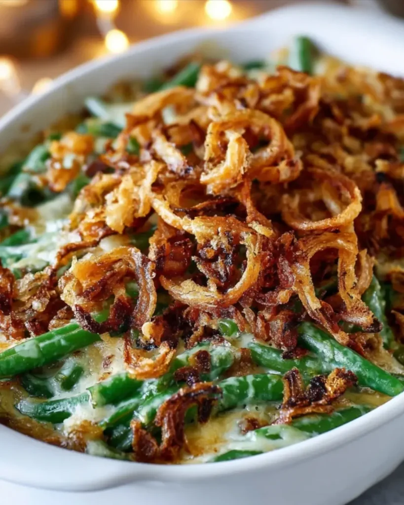 A delicious and creamy homemade green bean casserole topped with crispy onions, perfect for any occasion.