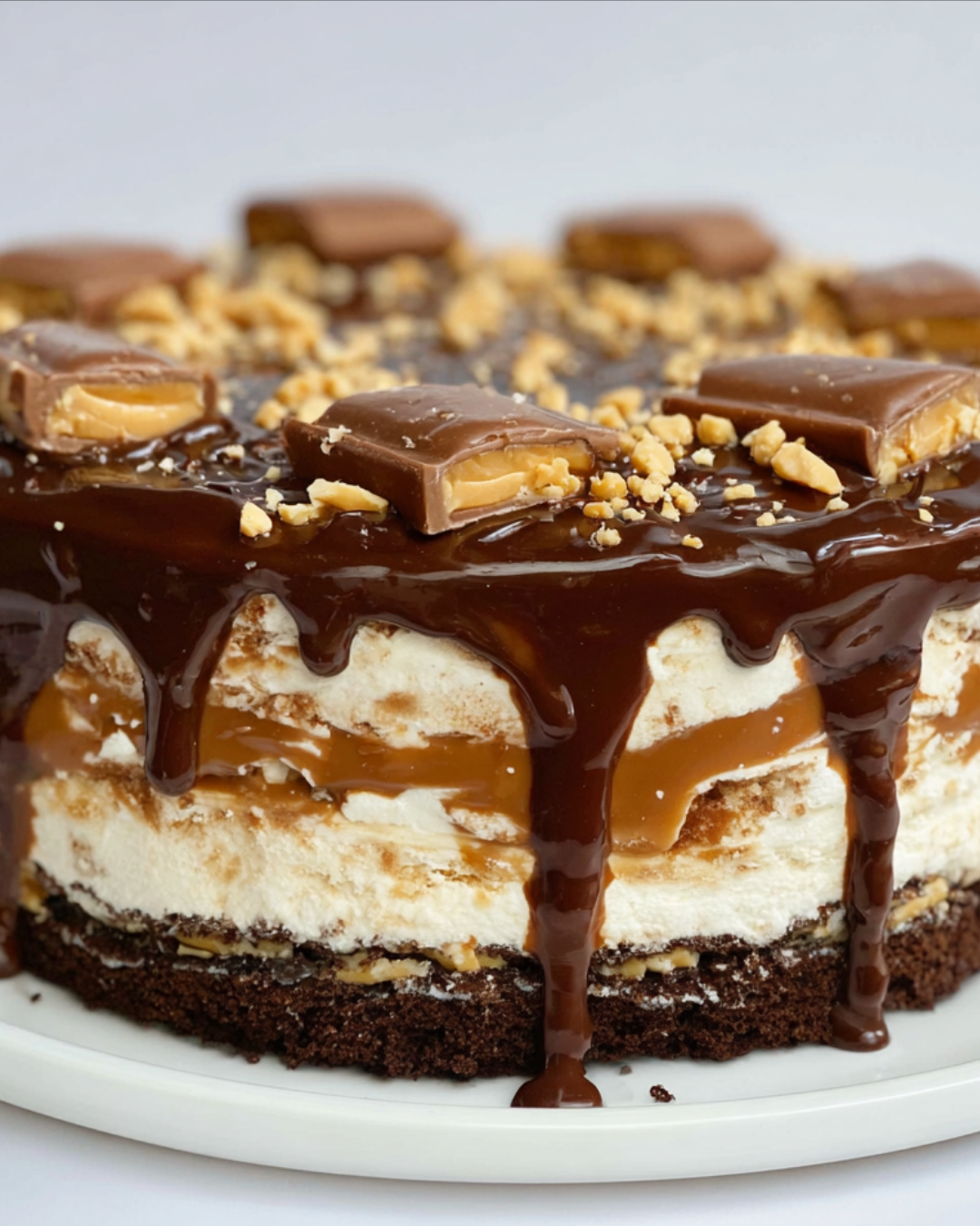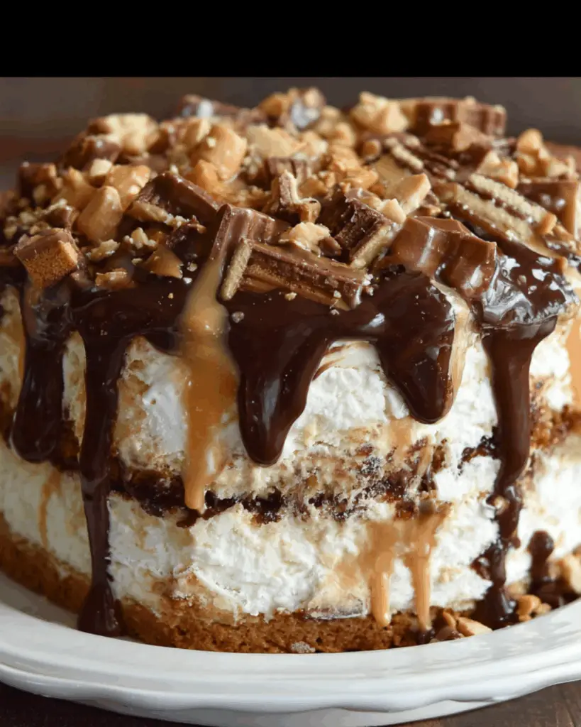 A delicious and indulgent dessert that combines the flavors of Snickers bars and ice cream in a cake form.