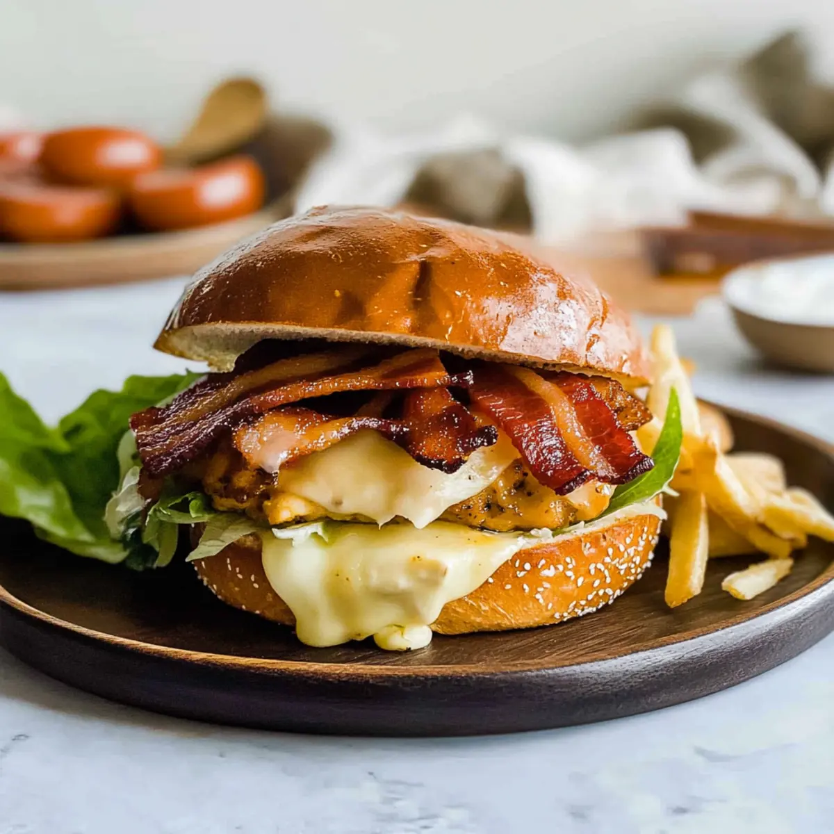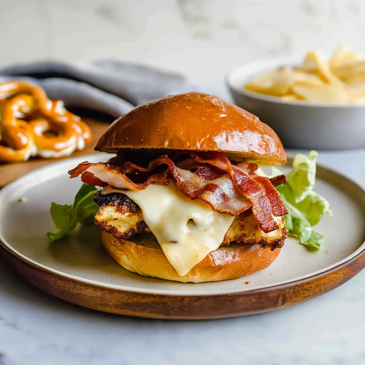 To assemble your Honey Dijon Chicken Sandwiches, take the bottom half of each pretzel bun and place a cooked cutlet on top. Layer with Swiss cheese, crispy bacon, and drizzle with the thickened honey Dijon sauce. Add optional lettuce and tomato for extra flavor and crunch, then cap with the top bun for a delightful finish.