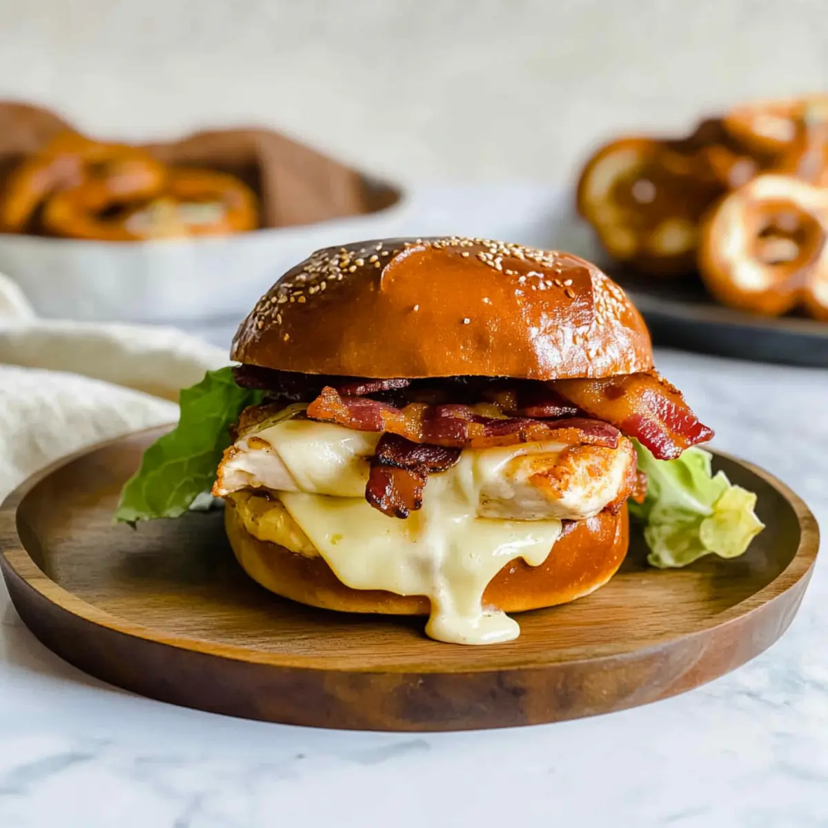 - To assemble, take the bottom half of each pretzel bun, place a cooked cutlet, layer with Swiss cheese, crispy bacon, drizzle with thickened sauce, and add optional lettuce and tomato. Cap with the top bun.