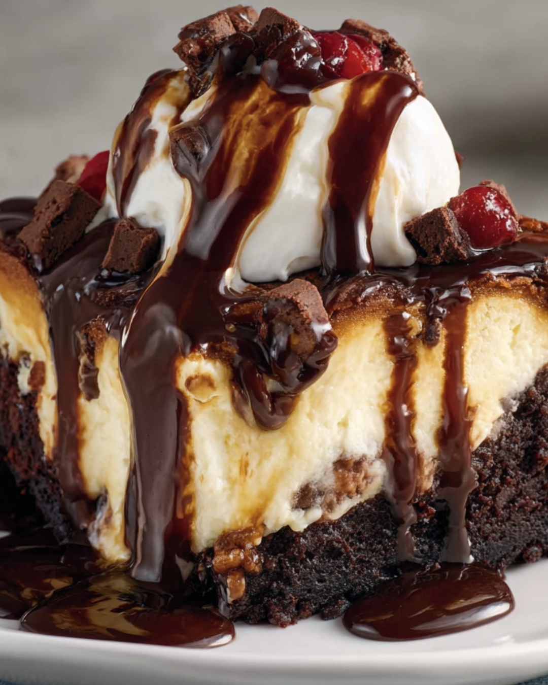 A rich and indulgent dessert combining layers of brownie, cheesecake, and hot fudge, topped with whipped cream and cherries.