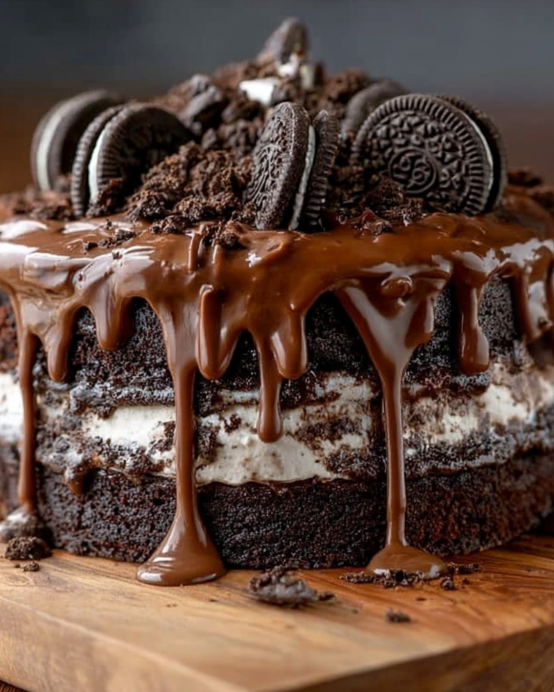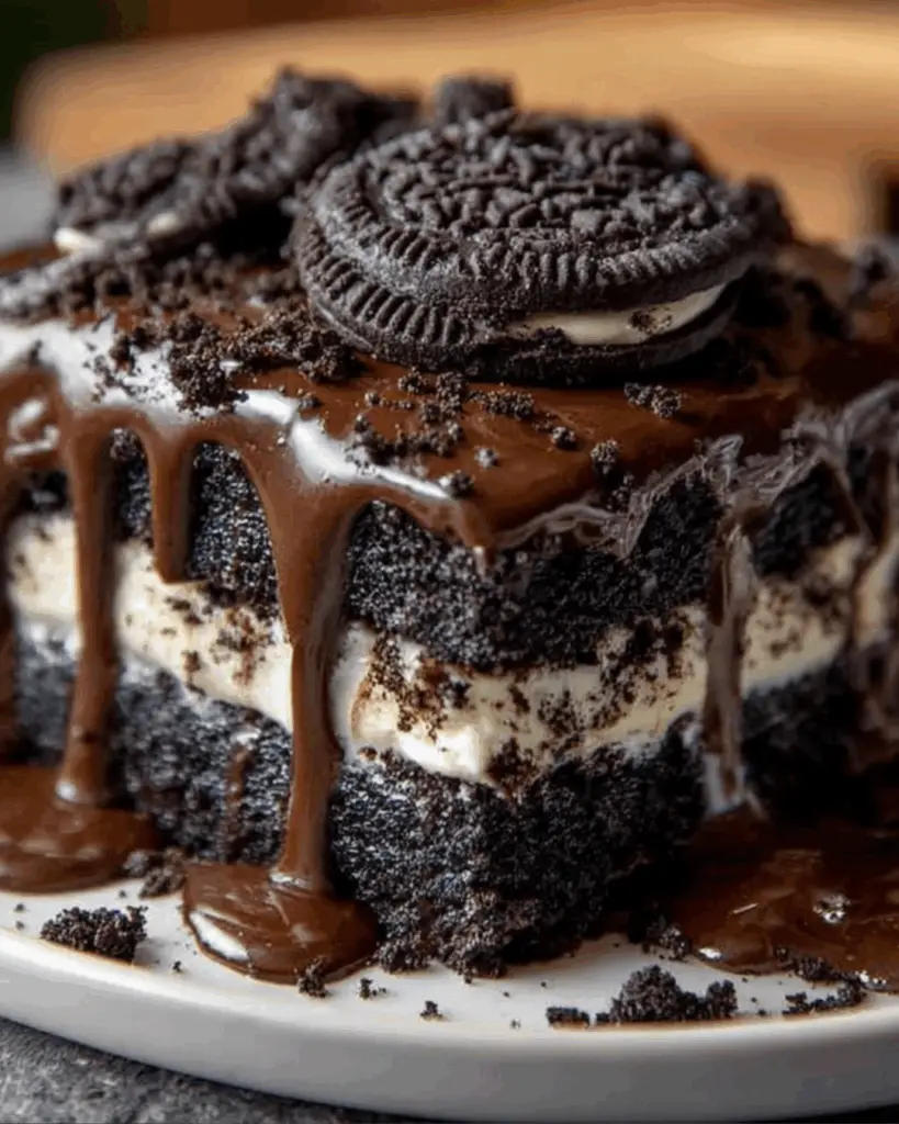 A decadent dessert recipe featuring a fudgy cake made with Oreo cookies, perfect for chocolate lovers.