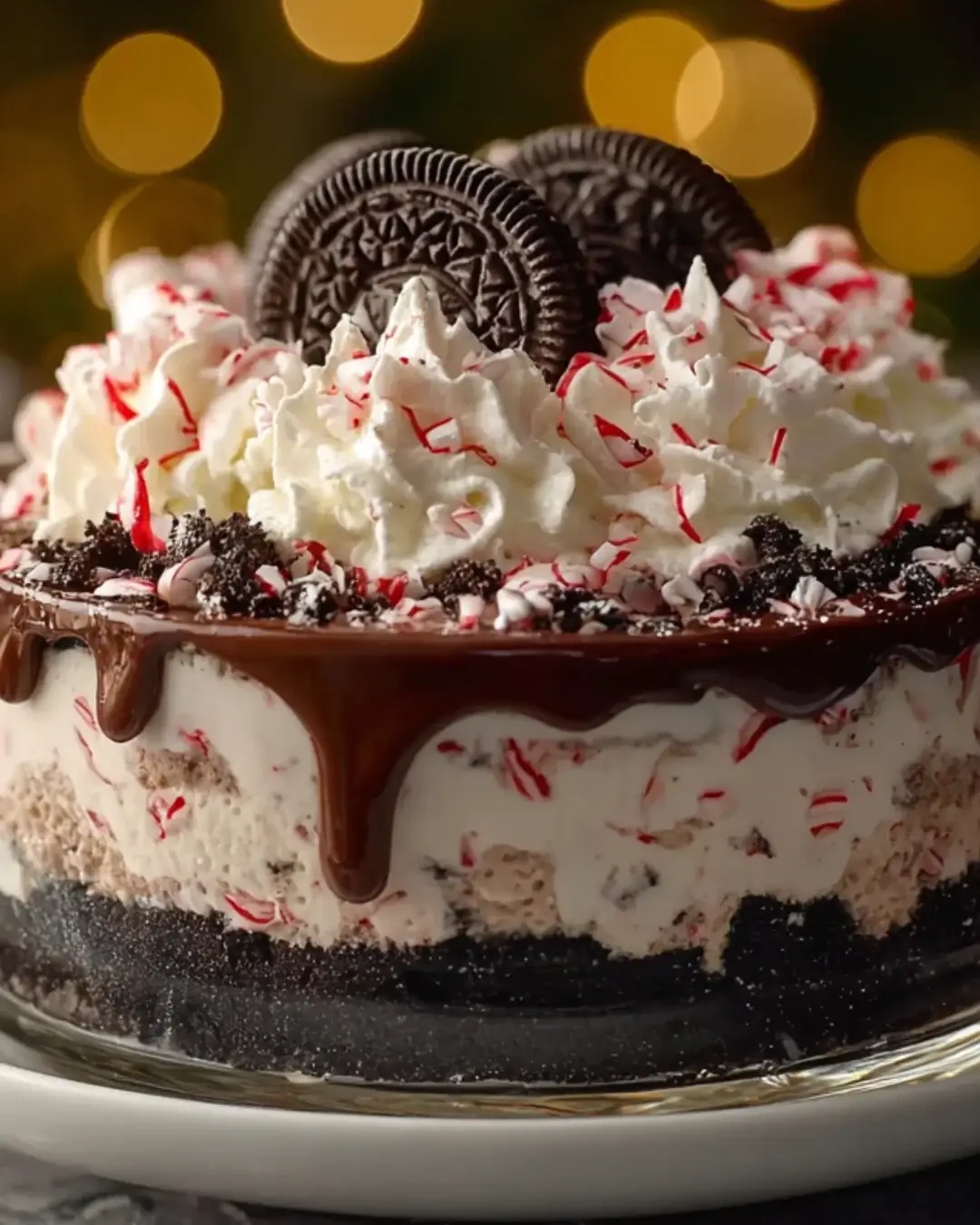 A delightful and festive dessert featuring crushed Peppermint Oreo cookies, cream cheese, and whipped topping, perfect for Christmas celebrations.