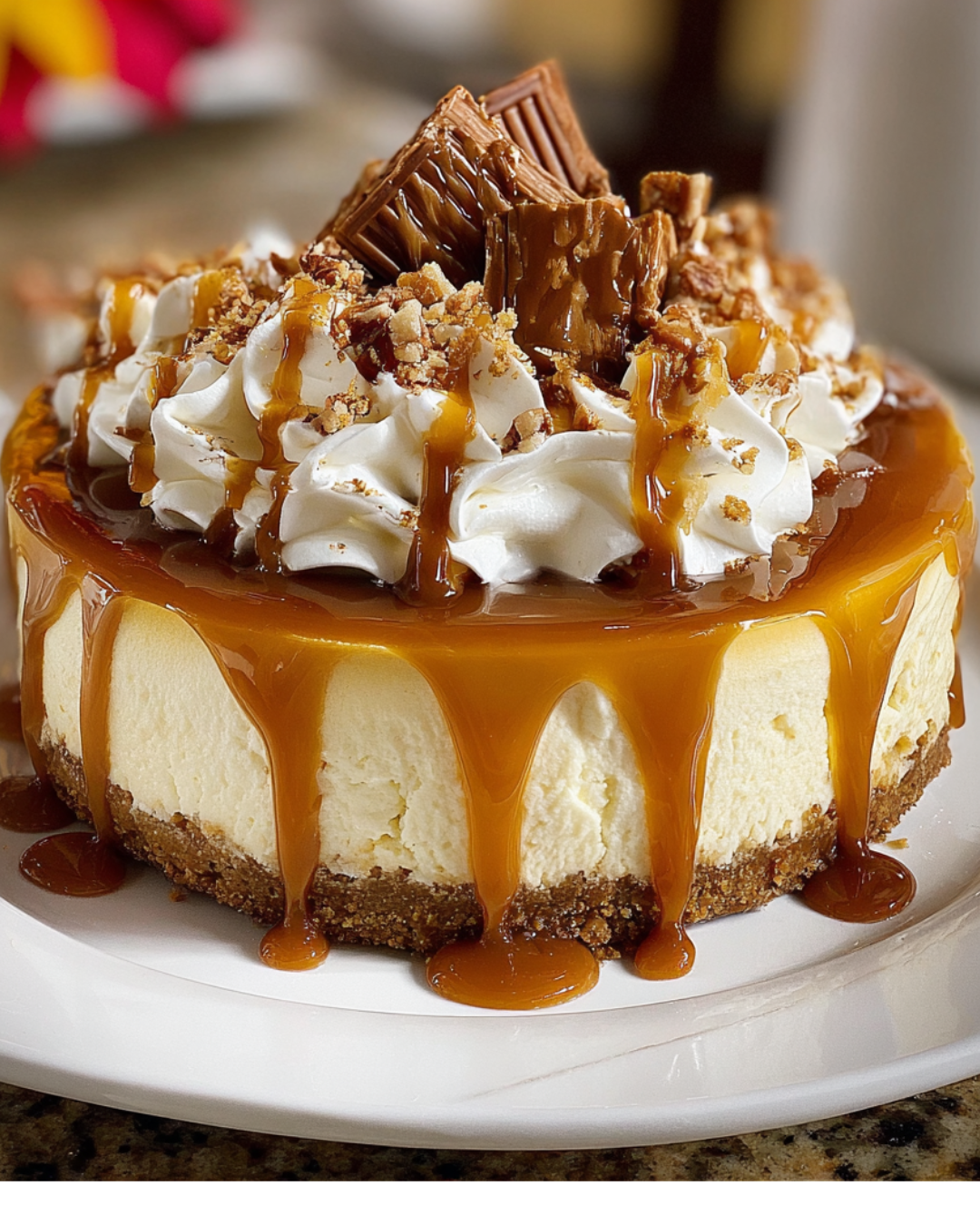 - Before serving, drizzle caramel sauce over the top of the cheesecake. Slice and serve with whipped cream if desired.