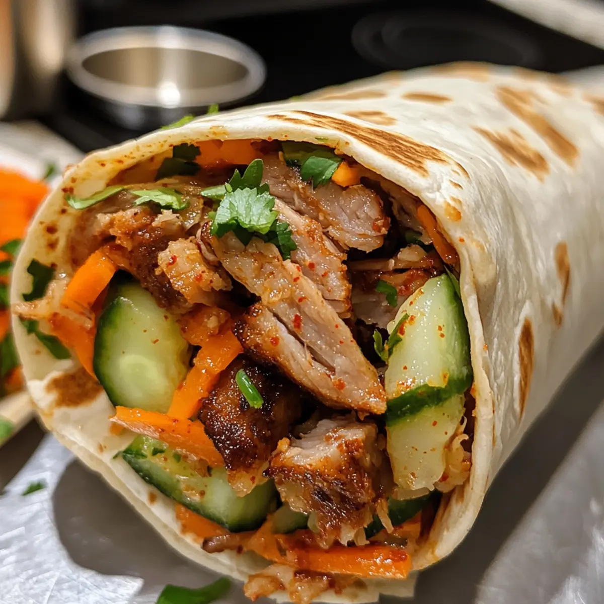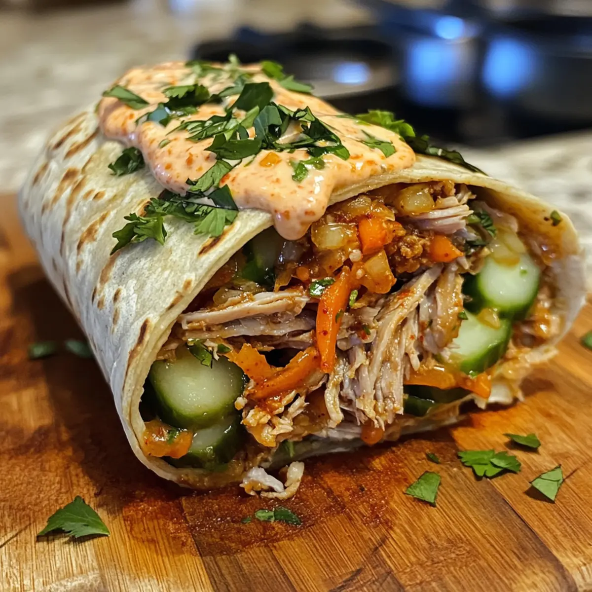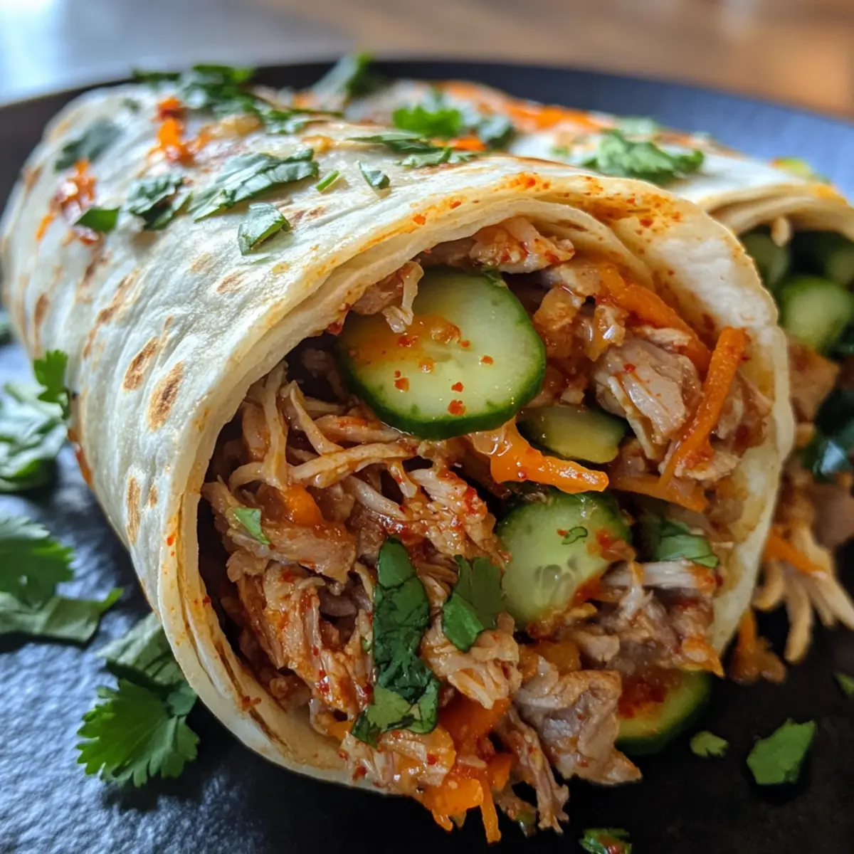 - Assemble Burritos: Layer a warm tortilla with rice, shredded pork, pickled veggies, fresh herbs, kimchi, and kimchi mayo.