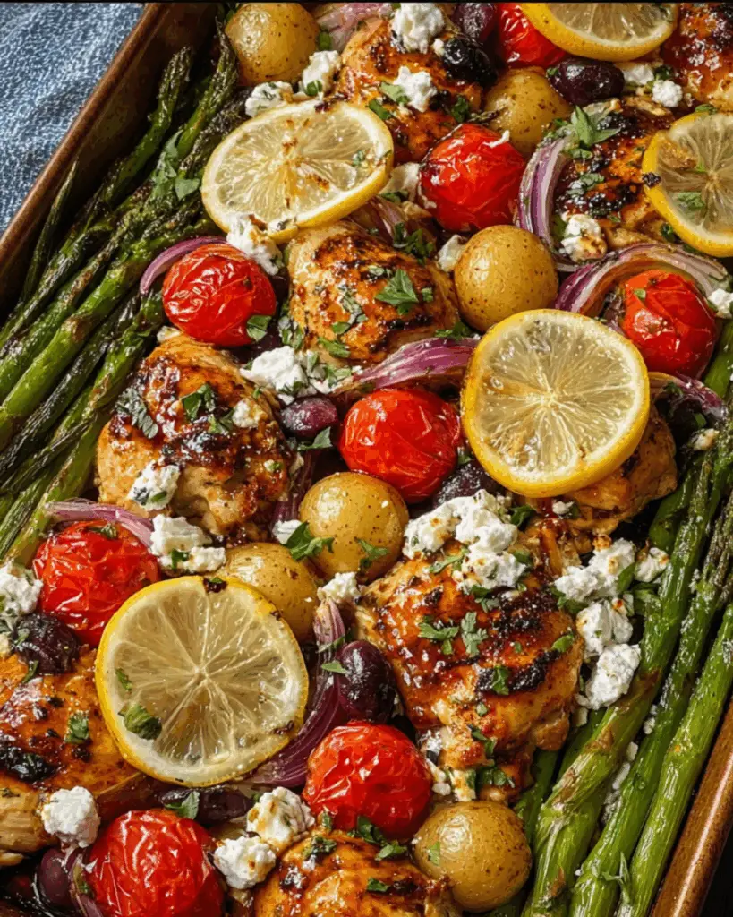 A delicious and easy Lemon Feta Chicken Sheet Pan Dinner that combines marinated chicken breasts with cherry tomatoes, red onions, Kalamata olives, and feta cheese, all baked to perfection.