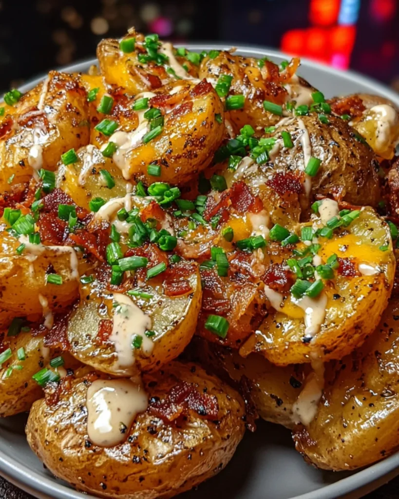 Once the potatoes are perfectly roasted, take them out of the oven. Sprinkle the shredded cheddar cheese and crumbled bacon generously over the top. Return the baking sheet to the oven for an additional 5 minutes. This will melt the cheese into gooey perfection, making your potatoes even more irresistible.