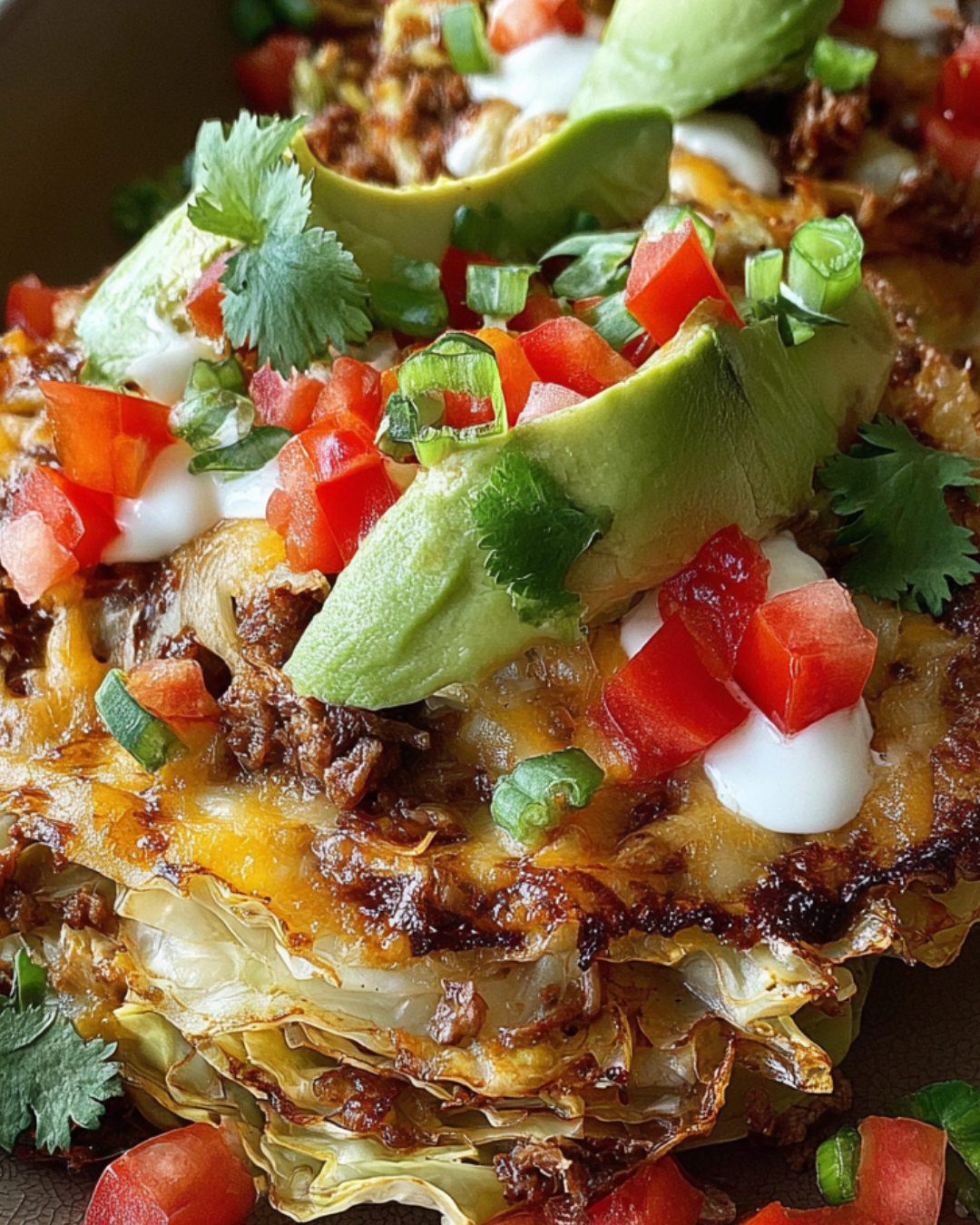 Finally, remove the baking sheet from the oven. Garnish each steak with diced avocado, a dollop of sour cream, and a sprinkle of fresh cilantro. Serve with lime wedges on the side for that zesty kick. Your Loaded Taco Cabbage Steaks are now ready to impress!