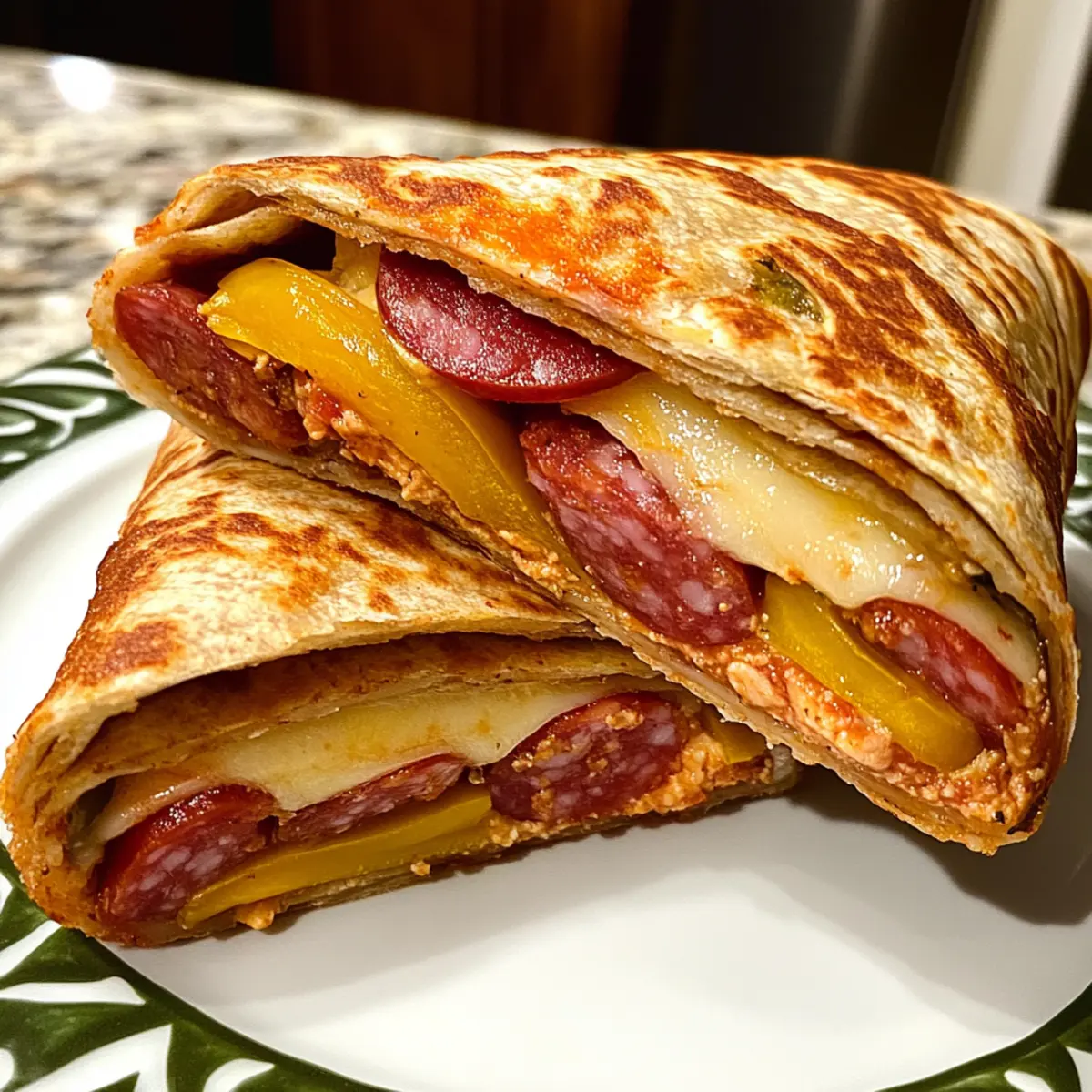 - Assemble the wrap by placing a low-carb tortilla in the pan, layering with provolone cheese, salami, pepperoni, and banana peppers.
