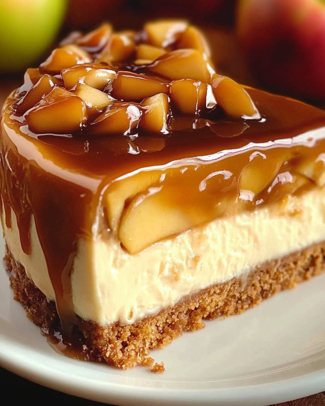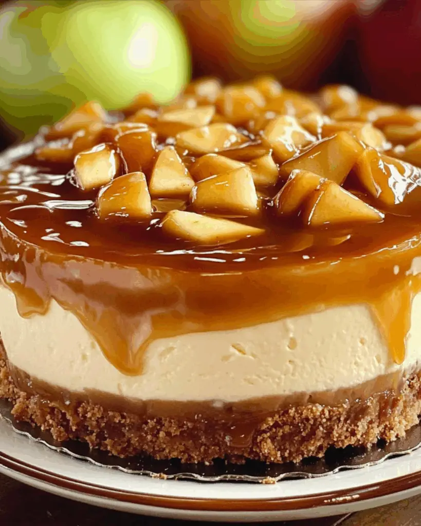 A rich and creamy cheesecake infused with the flavors of caramel and apples, perfect for any special occasion.