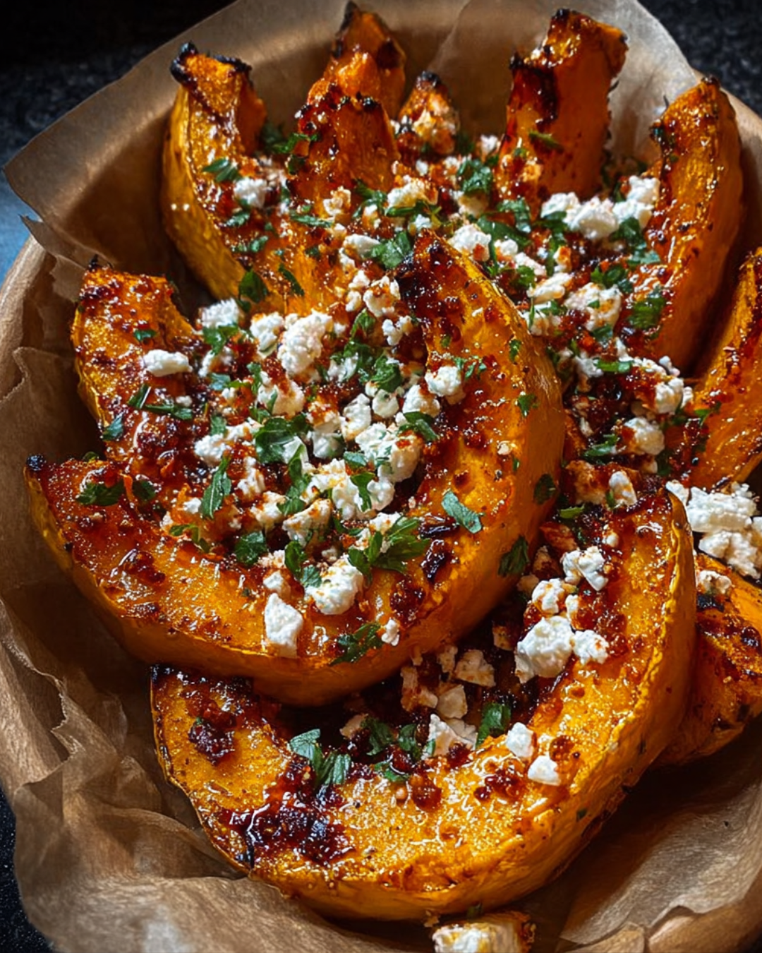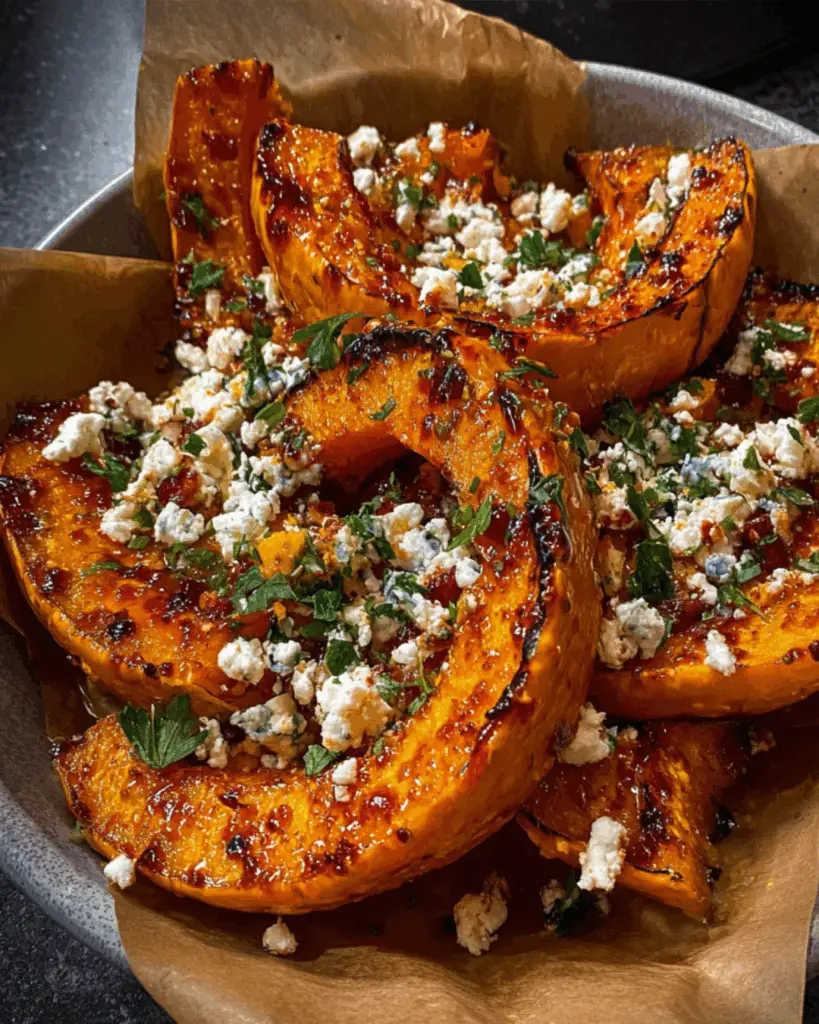 A delicious and flavorful dish featuring roasted pumpkin enhanced with maple syrup, chili powder, and crumbled feta cheese.