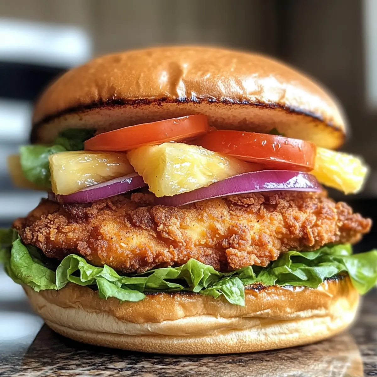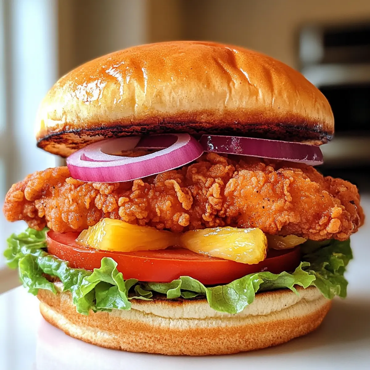 - Spread sauce on the bottom half of each toasted bun and layer with crispy fried chicken, shredded lettuce, sliced tomatoes, sliced red onion, and a pineapple slice.