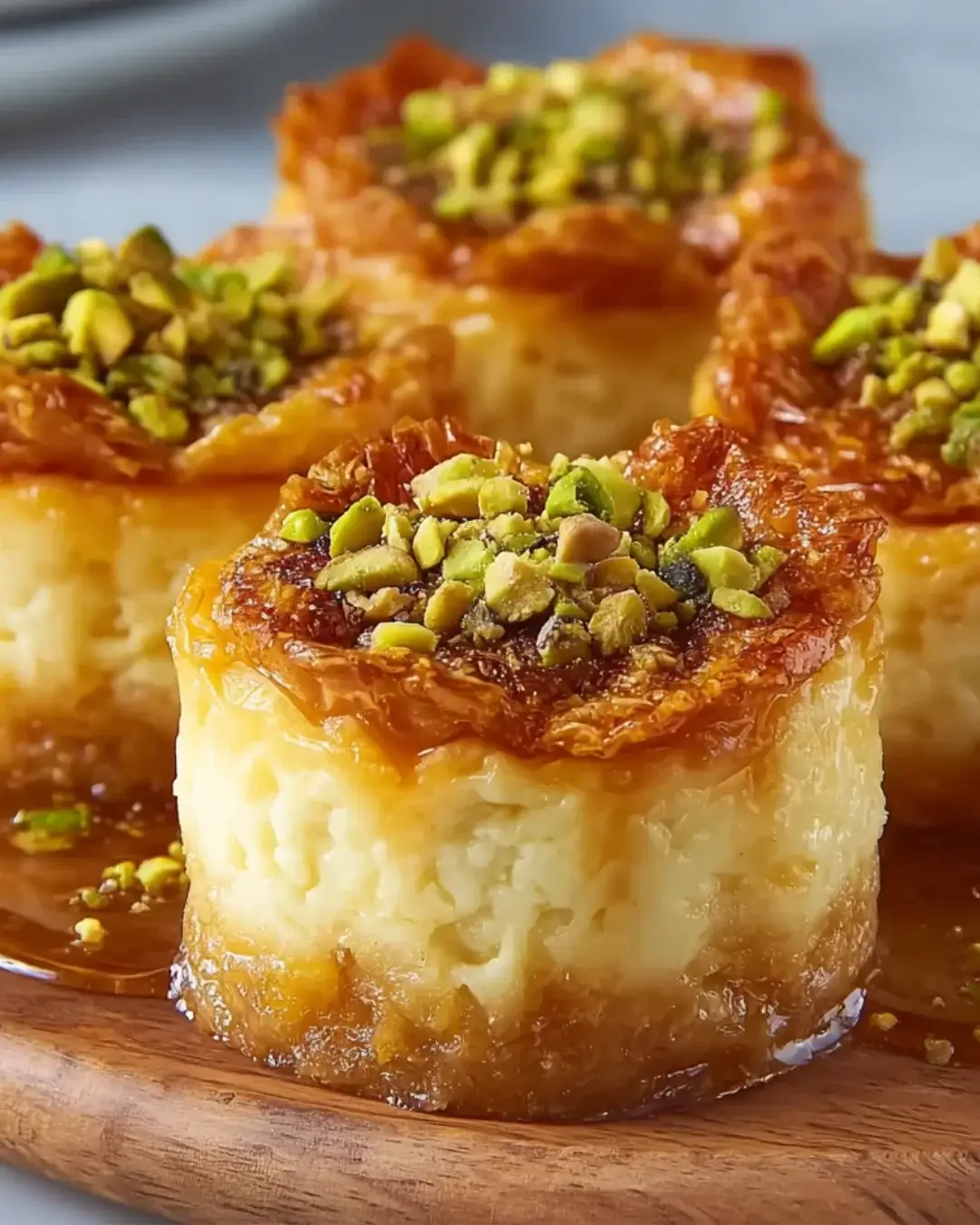 - Drizzle the honey syrup over the cooled cheesecakes and sprinkle with chopped pistachios before serving.