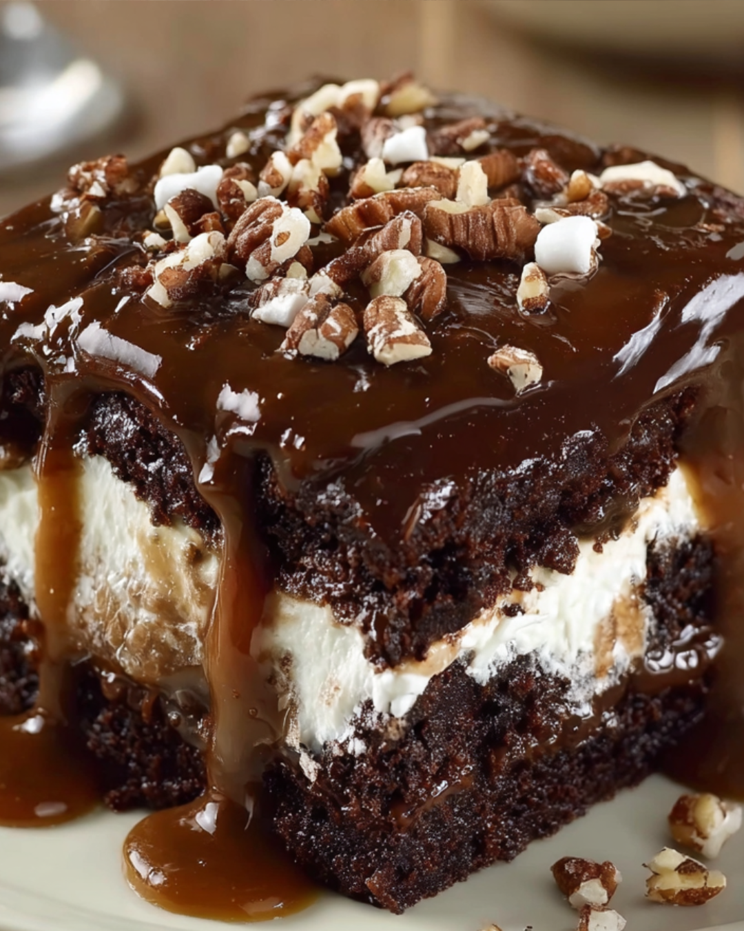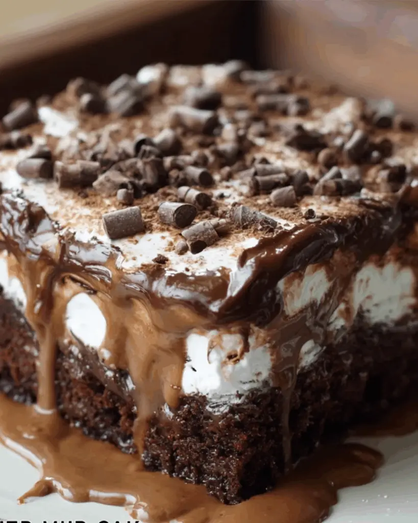 Mississippi Mud Cake is a rich, chocolatey dessert that combines a fudgy cake with a creamy frosting, often topped with marshmallows and chocolate chips.