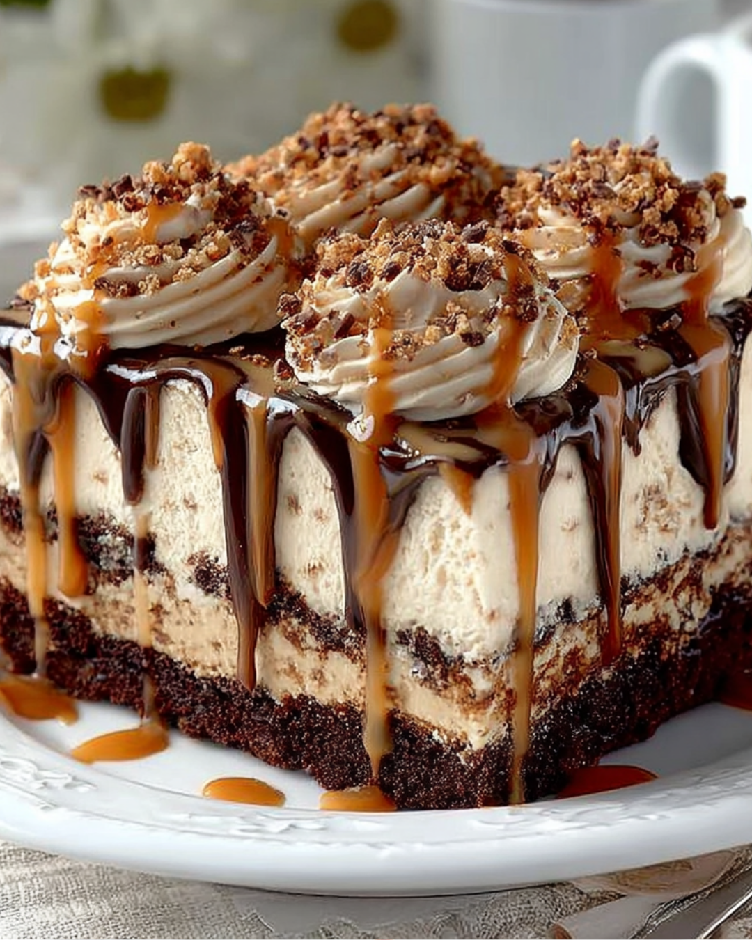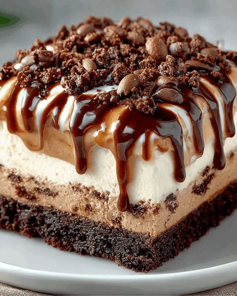 A decadent Mocha Ice-Cream Cake that combines layers of coffee and chocolate ice cream with a chocolate cookie crust, topped with whipped cream and chocolate syrup.