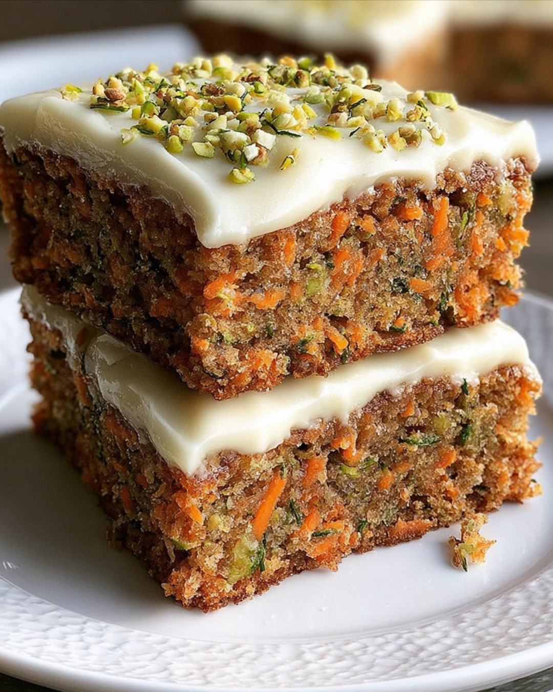 A deliciously moist carrot zucchini cake topped with creamy cream cheese frosting, perfect for any occasion.