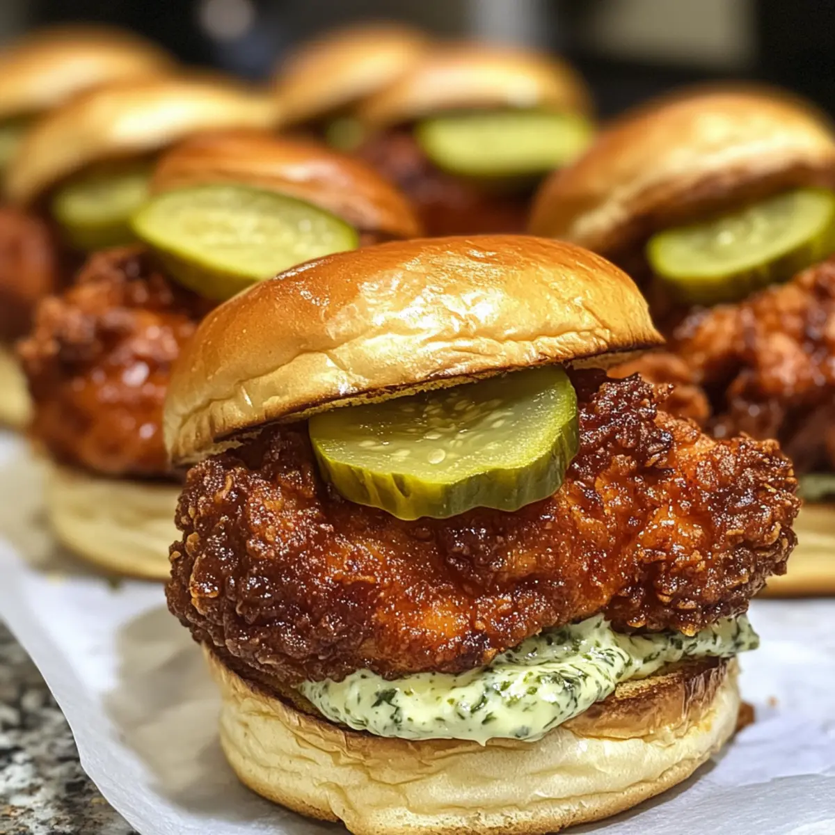 - Serve the assembled Nashville Hot Chicken Sliders on a platter with extra aioli for dipping.