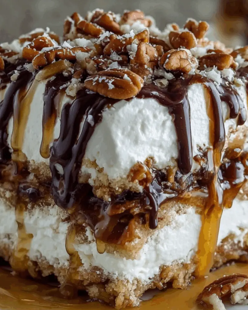 When you’re ready to serve, drizzle additional caramel and chocolate syrup on top. Feel free to garnish with extra pecans and chocolate chips for that finishing touch. Your No Bake Turtle Lasagna Dessert is now ready to impress!