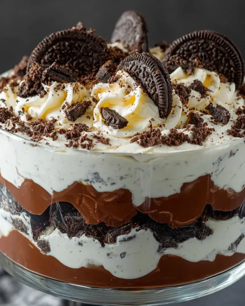 Oreo Cookie Trifle is a decadent dessert that layers crushed Oreo cookies, chocolate pudding, and whipped topping for a delightful treat.