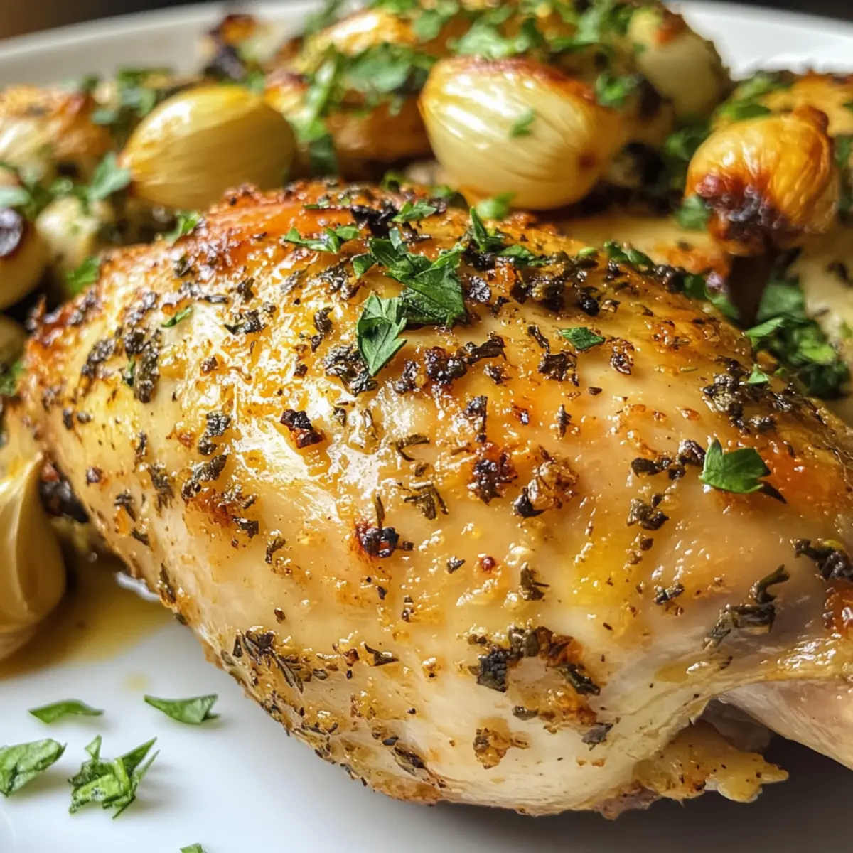 Once the chicken has roasted to perfection, remove the dish from the oven and tent it with foil to keep it warm. Allow the chicken to rest for a few minutes while you pour the rich pan sauce over it, ensuring every bite is infused with that delicious mix of garlic and herbs. Now you’re ready to serve and enjoy this delightful dish!