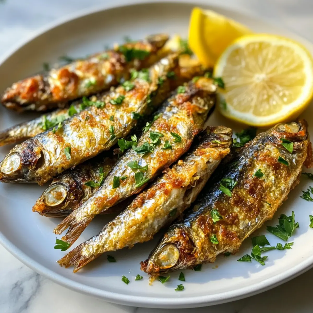 Plate your golden, crispy pan-fried sardines, garnishing with a sprinkle of chopped parsley for a burst of freshness. Serve them alongside lemon wedges to squeeze over the fish, enhancing their flavors. Enjoy this delightful dish warm, either as a great tapas option or a satisfying seafood meal!