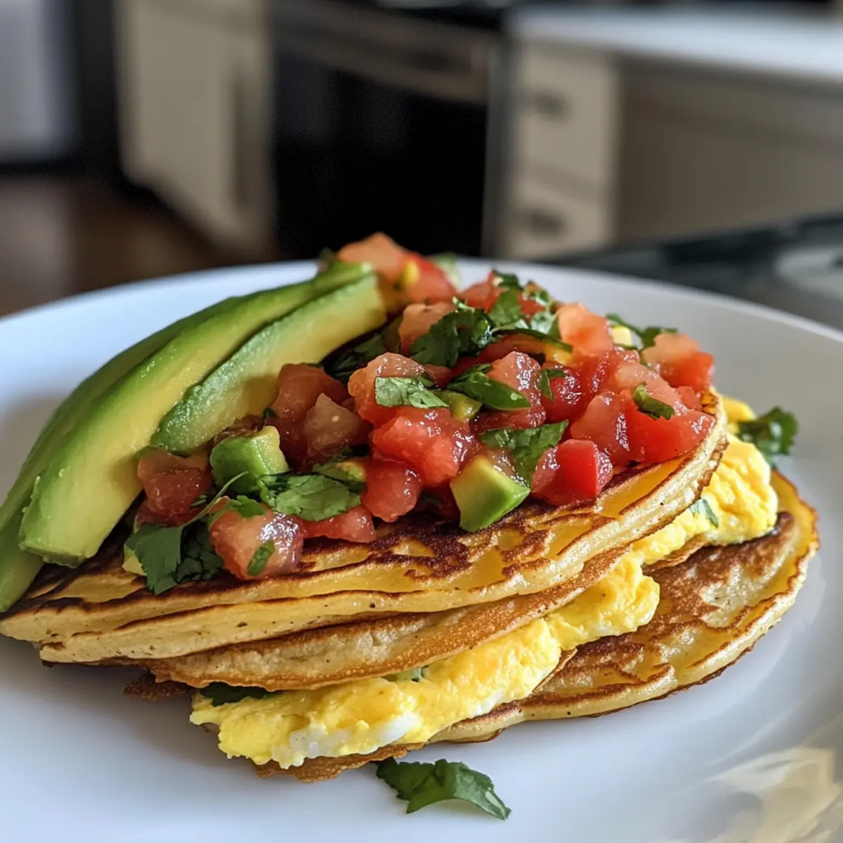 Take a warm pancake and lay it flat on a plate. Spoon a generous portion of the scrambled eggs in the center, and if desired, sprinkle cheese over the top for added creaminess. Drizzle salsa on your egg filling for a burst of flavor and color, then add any additional toppings like avocado or sour cream according to your preference.
