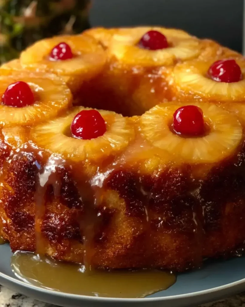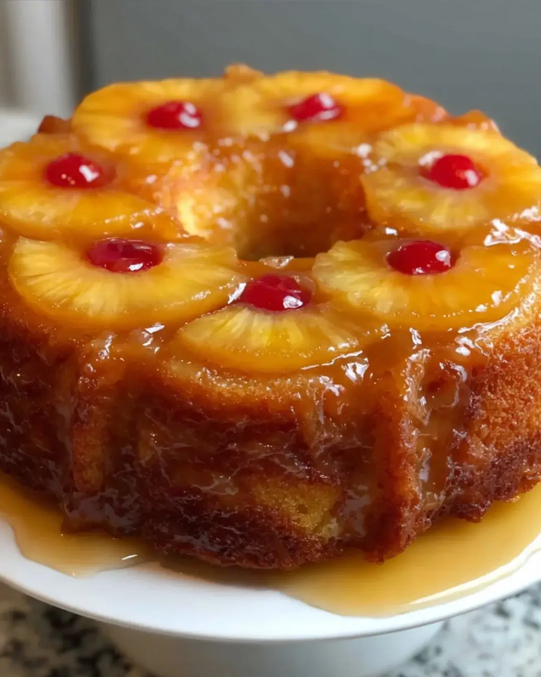 A delicious and visually stunning Pineapple Upside Down Bundt Cake that combines the sweetness of pineapple and cherries with a moist cake.
