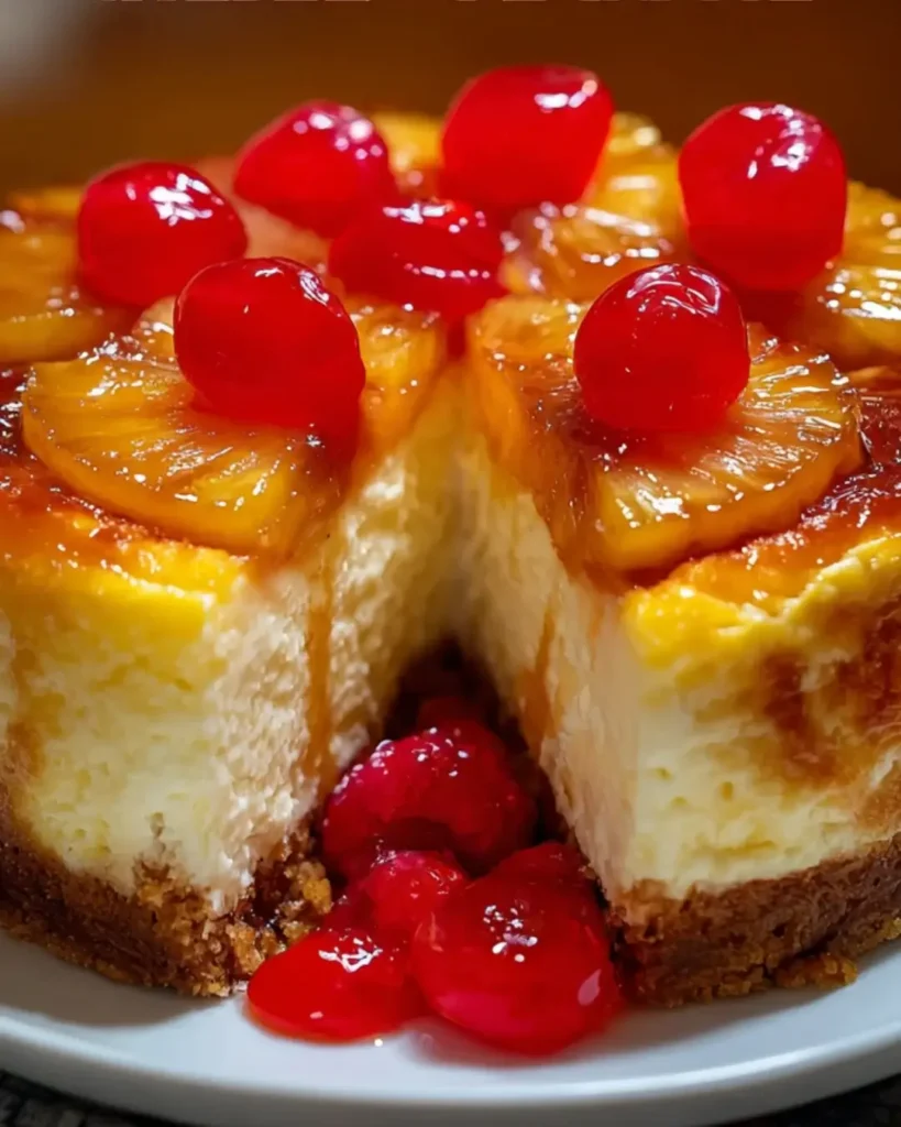 Indulge in this delightful Pineapple Upside Down Cheesecake, a perfect blend of creamy cheesecake and sweet pineapple topping.