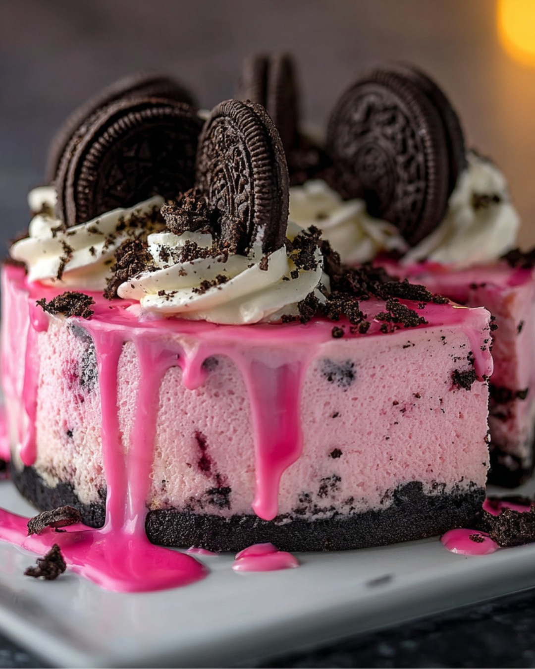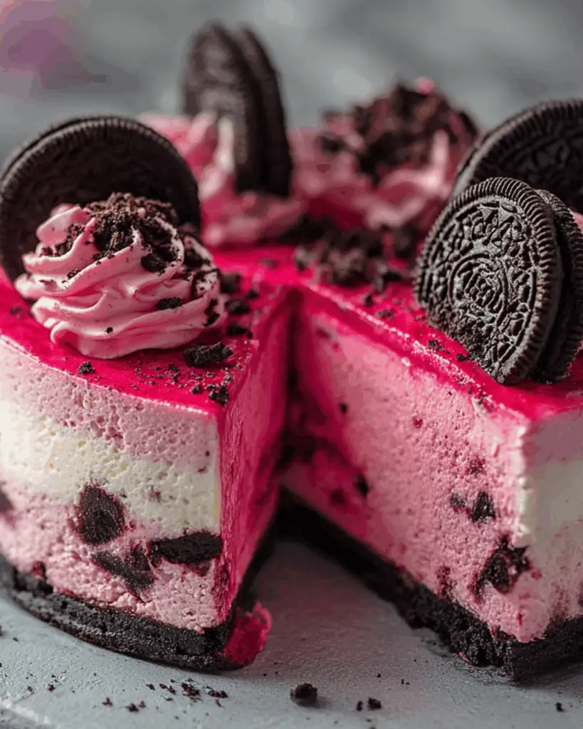 A delicious and visually stunning Pink Velvet Oreo Cheesecake that combines the rich flavors of cream cheese and Oreo cookies with a vibrant pink hue.