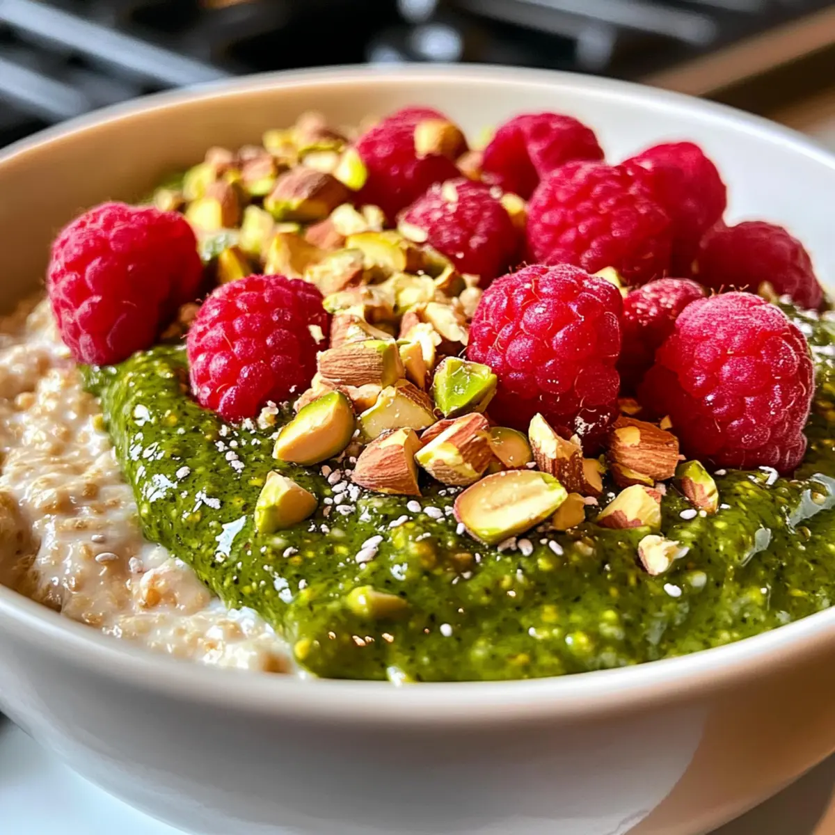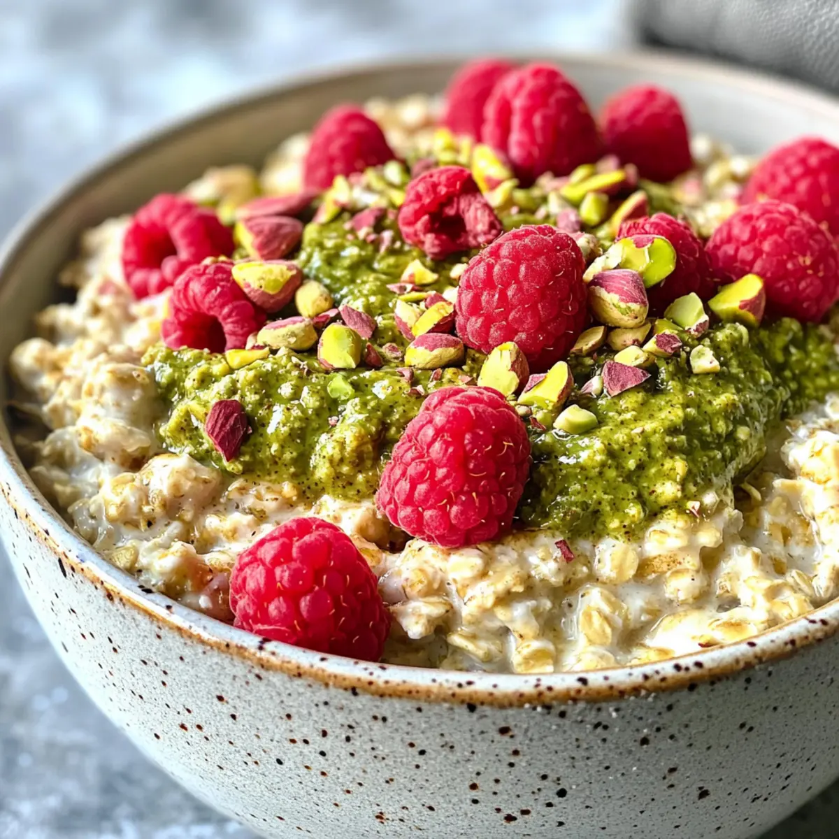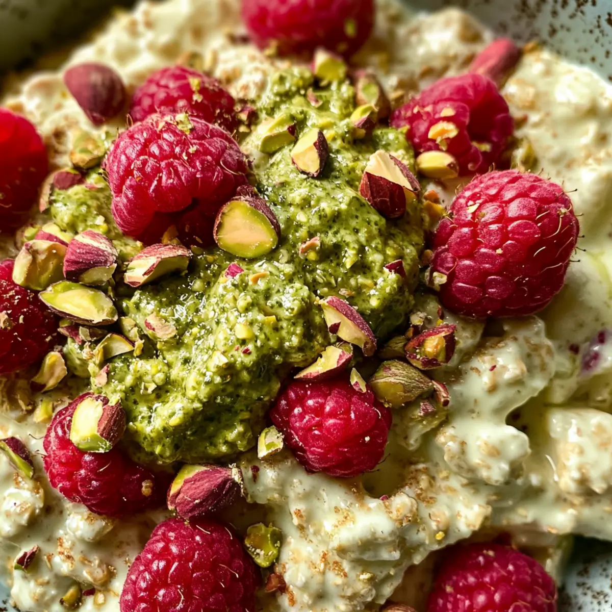 Finish by sprinkling fresh raspberries and chopped pistachios on top of your oats. The bright berries will add a burst of flavor and color, while the crunchy pistachios elevate the pistachio experience to new heights. This delightful topping will make your breakfast not only delicious but visually appealing too.