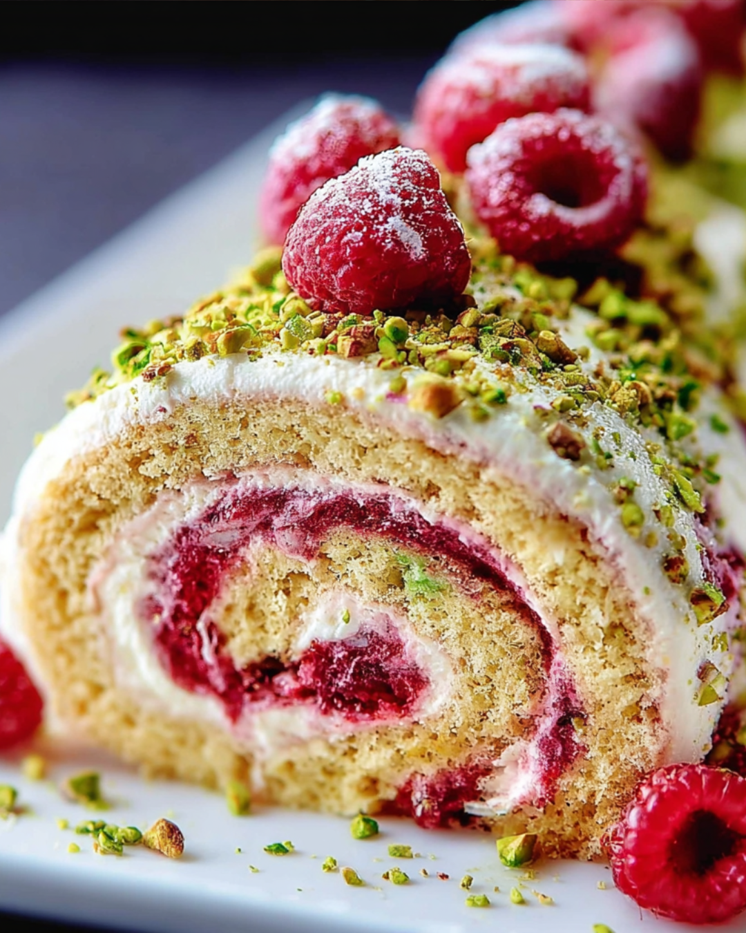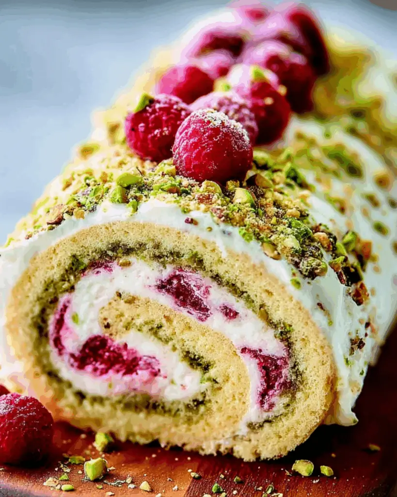 A delightful Pistachio Raspberry Swiss Roll that combines the nutty flavor of pistachios with the tartness of fresh raspberries, all wrapped in a light sponge cake.