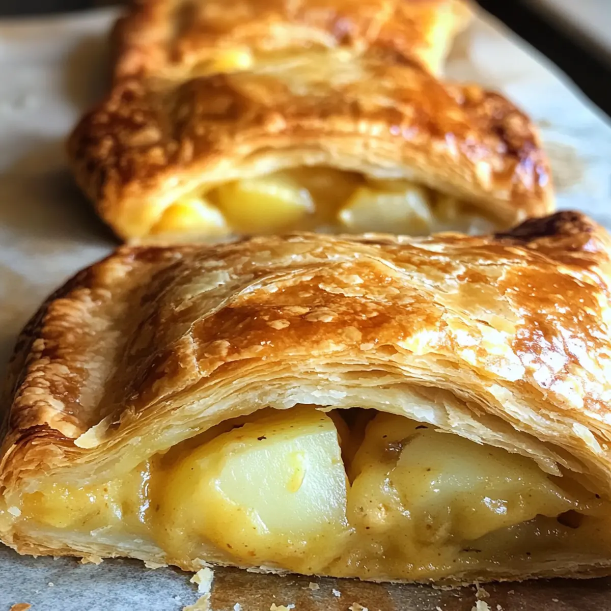- Preheat your oven to 200°C (390°F) and roll out the chilled puff pastry. Cut the pastry into four rectangles and spoon a generous amount of filling onto one side of each rectangle. Brush edges with beaten egg, fold over, and crimp to seal.