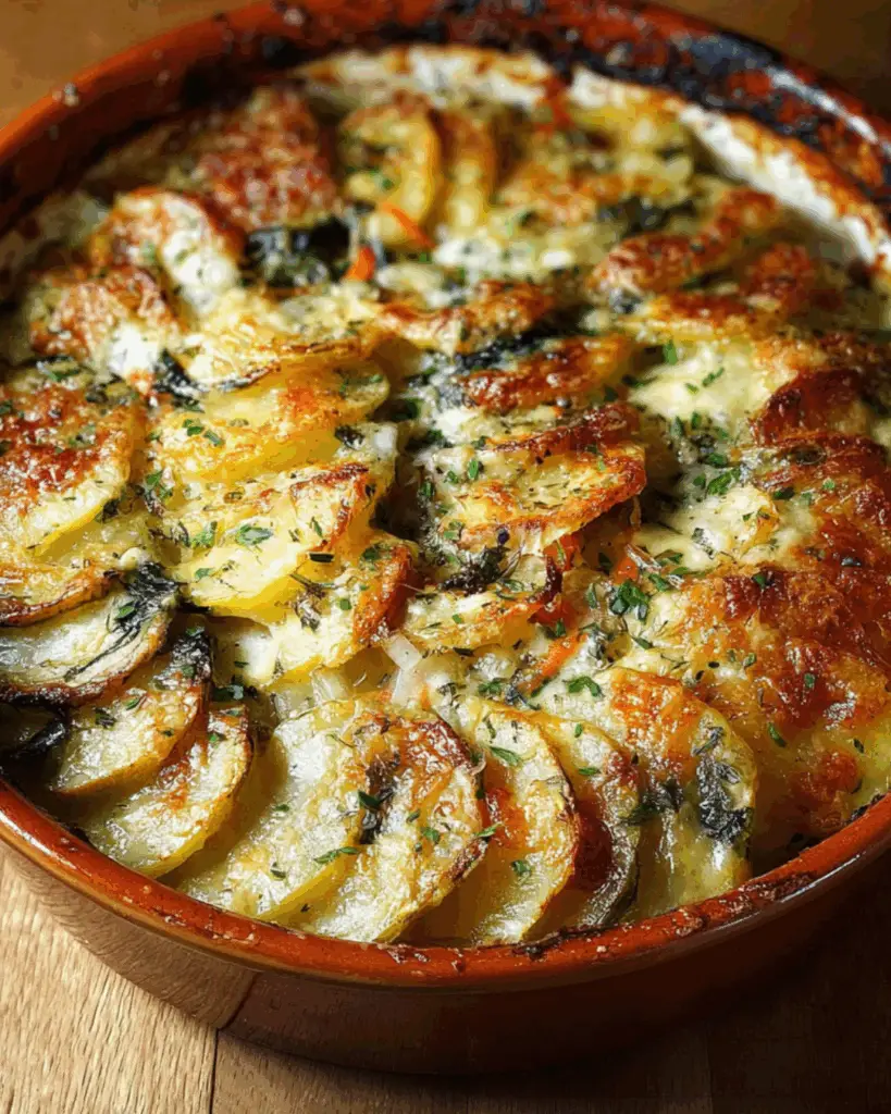 A creamy and delicious Potato and Vegetable Gratin that combines layers of thinly sliced potatoes, zucchini, yellow squash, and spinach, topped with cheddar cheese and a rich cream mixture.