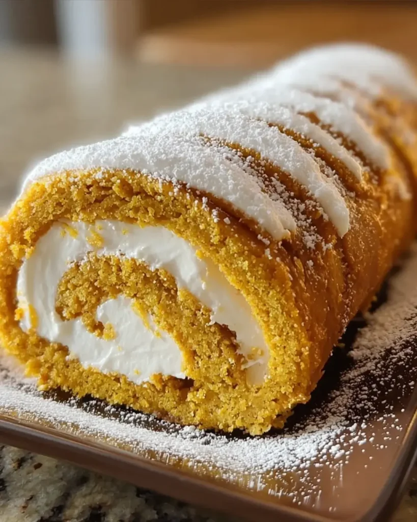 A delicious and moist pumpkin roll cake filled with creamy frosting, perfect for fall celebrations.