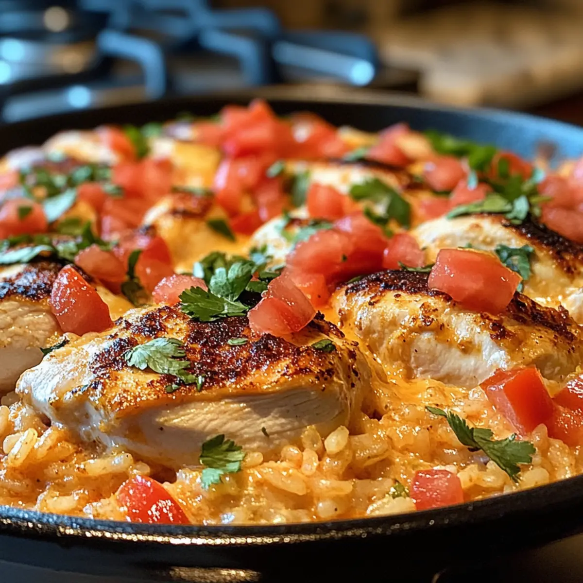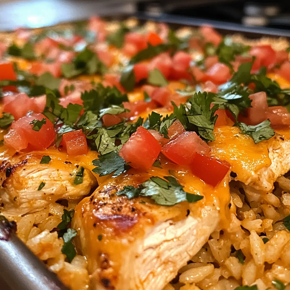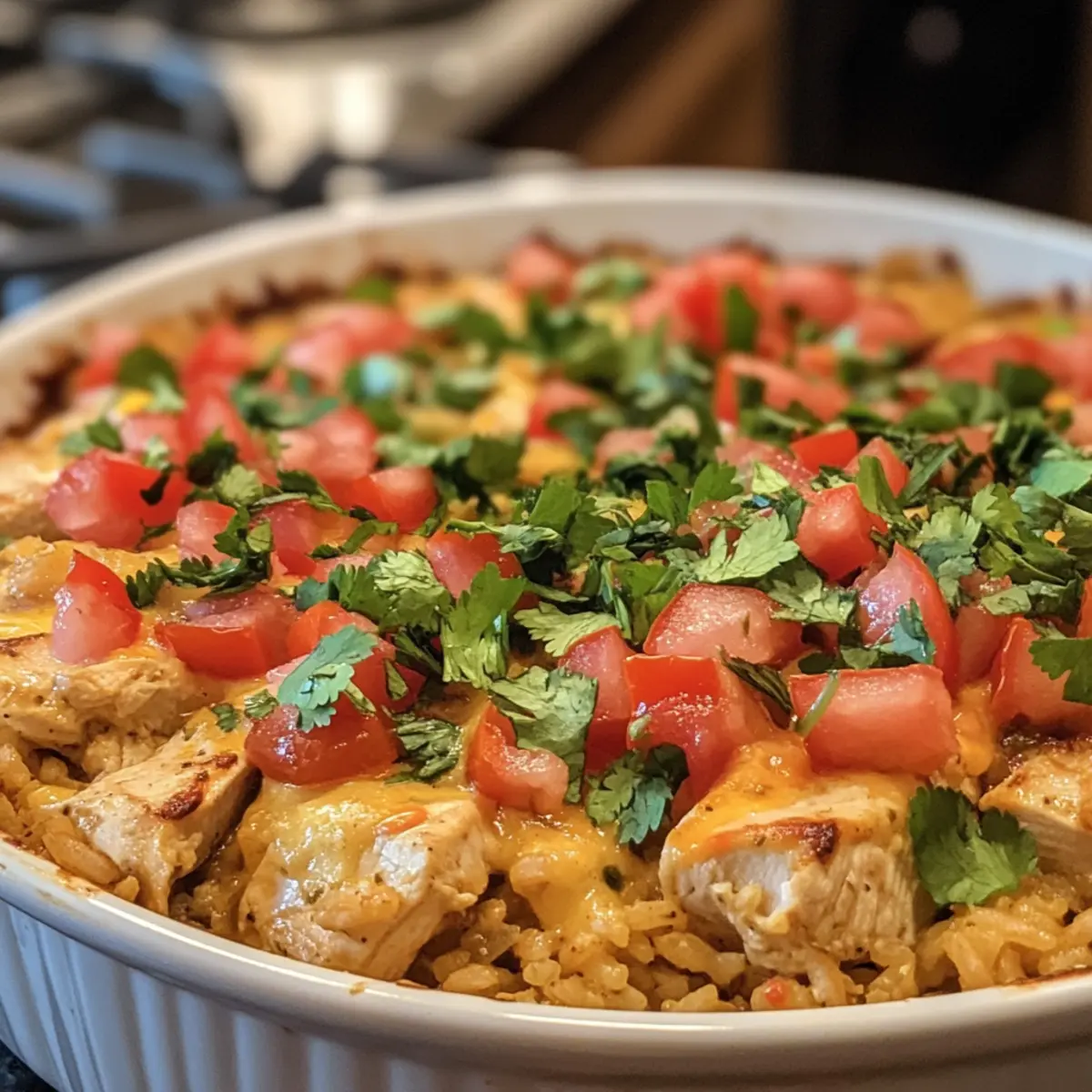 Once baked, remove the Queso Chicken and Rice Bake from the oven and let it sit for a few moments to set. Before serving, sprinkle chopped tomatoes and fresh cilantro over the top to add a pop of freshness and color. This final touch not only looks delightful but enhances the flavor profile of this comforting casserole!