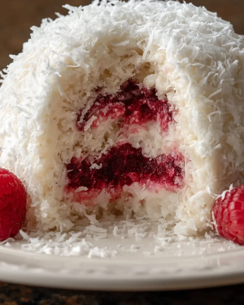 A delightful Raspberry Surprise Coconut Snowball Cake that combines the sweetness of raspberries with the richness of coconut, perfect for any occasion.