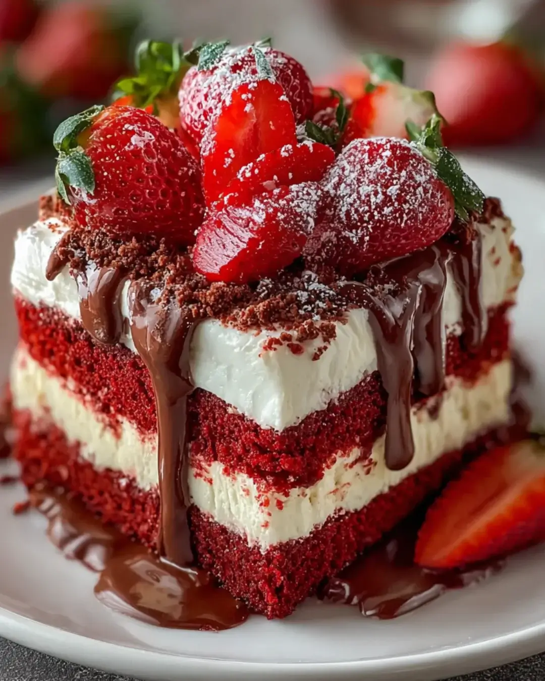 A delicious and visually stunning dessert that combines the rich flavors of red velvet cake with a creamy strawberry cheesecake topping.